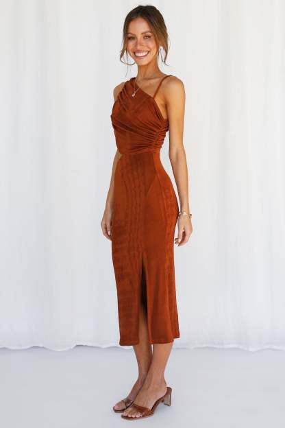 Jaws will drop! The Block It Out Midi Dress is the chicest thing out. oh and did we say oh so trendy! Featuring cut-outs to the sides and a gorgeous high neck feature. with a thick strap and thin strap. this will have you wanting more! Style yours with bouncy curls. simple heels and a glowing makeup look.