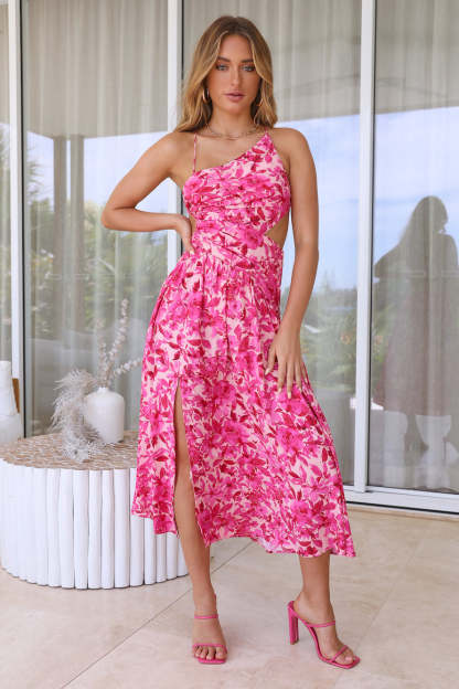 Be seen in this dress. girl. The Blooming As One Midi Dress features a one-shoulder design and tie-up feature. Style with heels for all the compliments.