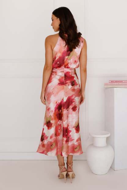 Get ready to feel your best in the Blossom Trails Satin Maxi Dress. Featuring a high-drape neckline. a silky satin silhouette and a gorgeous print. Style with heels for all the attention on you.