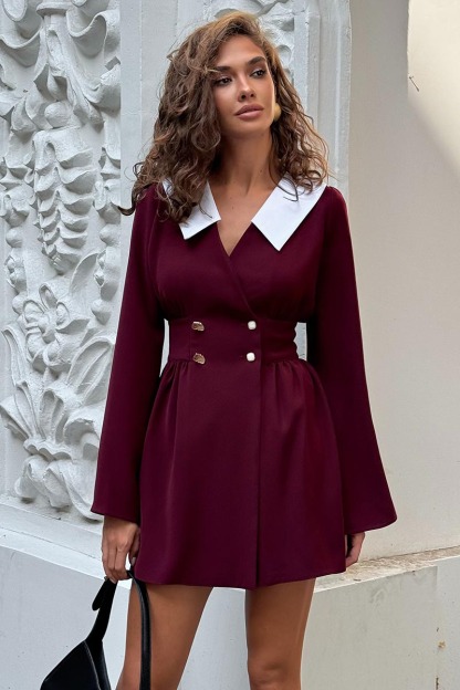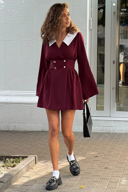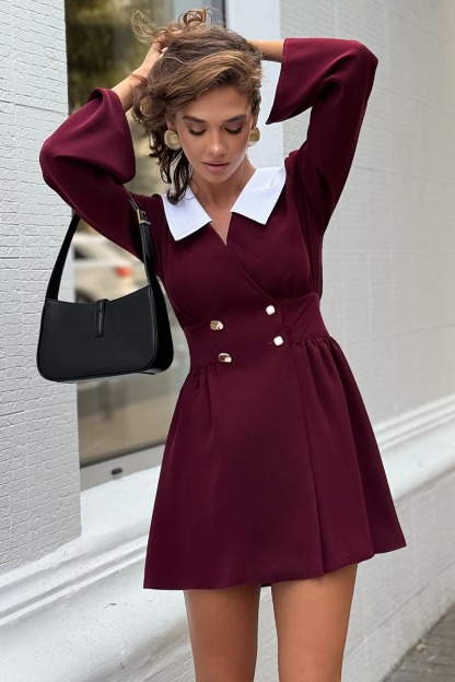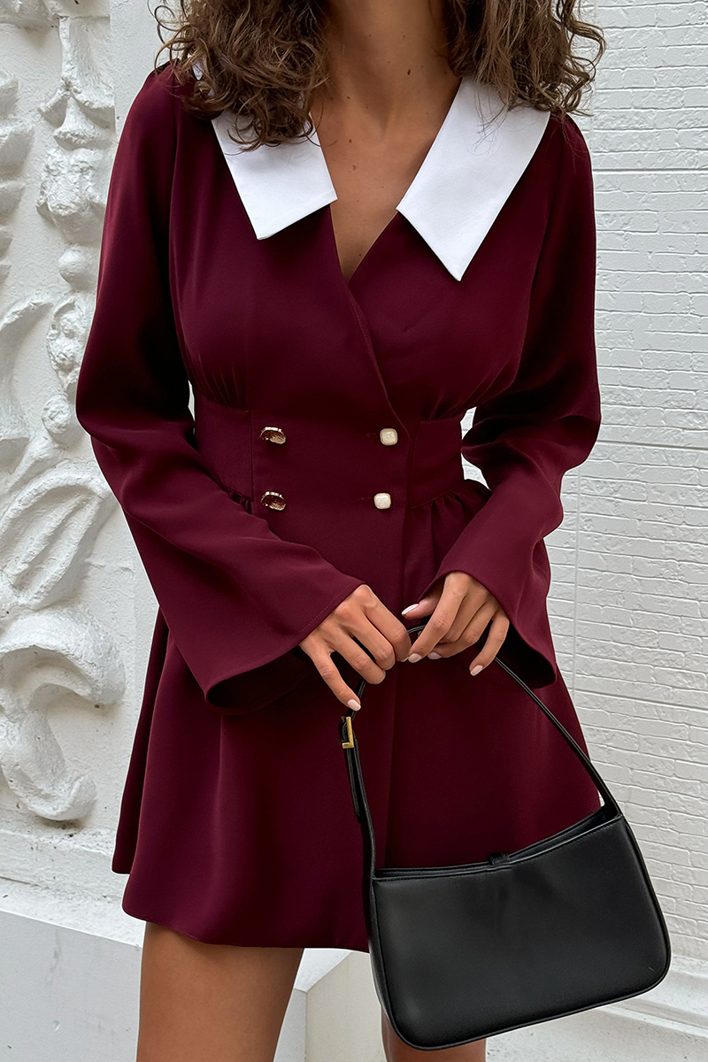 Color Block Cinch Waist Turndown Collar Mini Dresses-Burgundy Pre Order