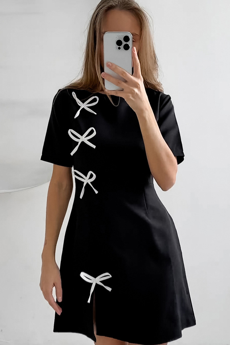 Color Matching Bowknot Boat Neck Slit Mini Dresses-Black