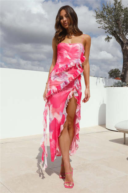 Be seen. be admired! The Glad We Met Mesh Frills Maxi Dress features a gorgeous frill design and a vibrant pattern that'll steal attention. Style with heels and curls for all the compliments.