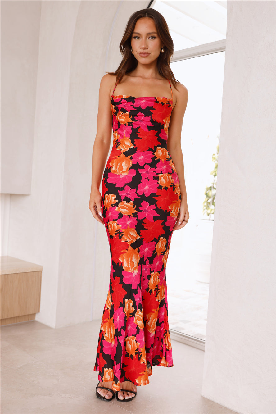 Girl. choose the fun look. The hayhty Tropics In Bloom Satin Maxi Dress features a crisscross detail to the back with a cowl detail and a gorgeous vibrant print. Style with heels for a look we're obsessed with.