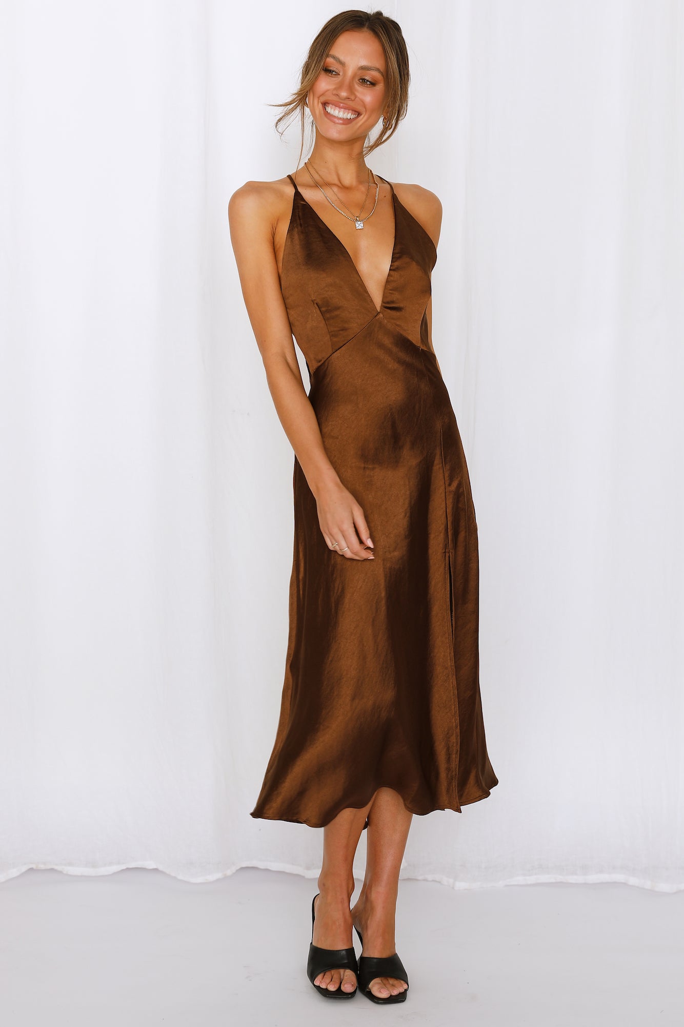 The La Di Da Midi Dress is a no-brainer. you know you'll slay with this one. Sweetheart neckline. flared bottom. satin. See what we mean? Style yours with heels and silver jewellery.
