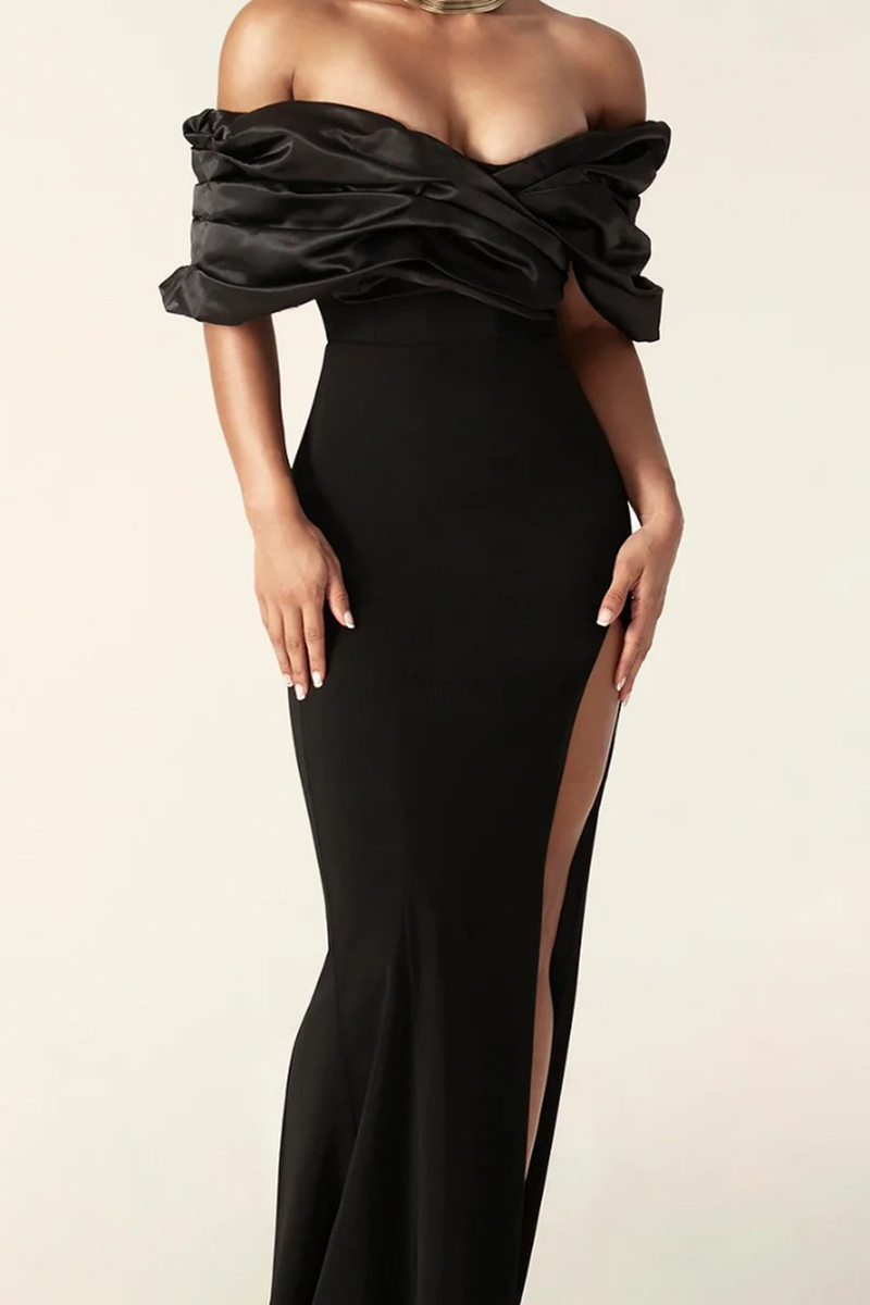 Ruffle Off The Shoulder High Slit Bodycon Evening Gown Maxi Dresses-Black