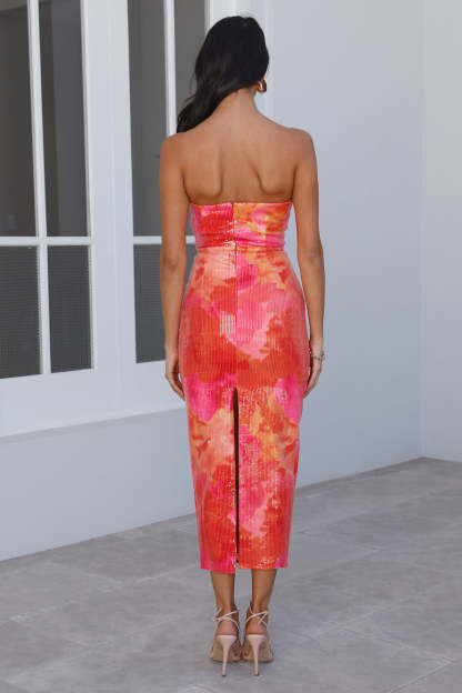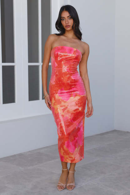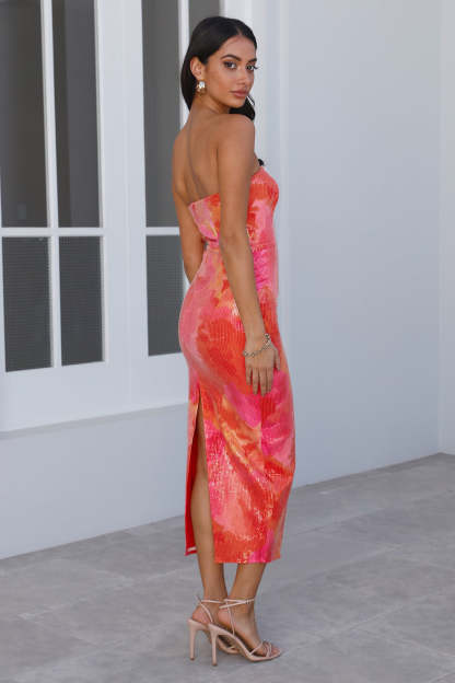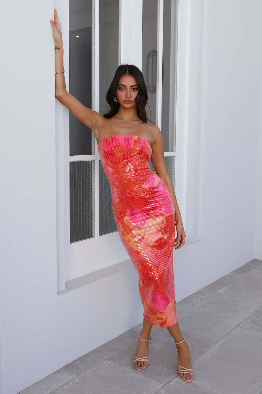 Make them stop and stare. The RUNAWAY Oralie Midi Dress features a strapless design and gorgeous patterned sequin details. Style with heels for all the likes.