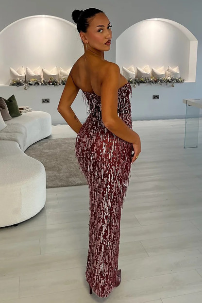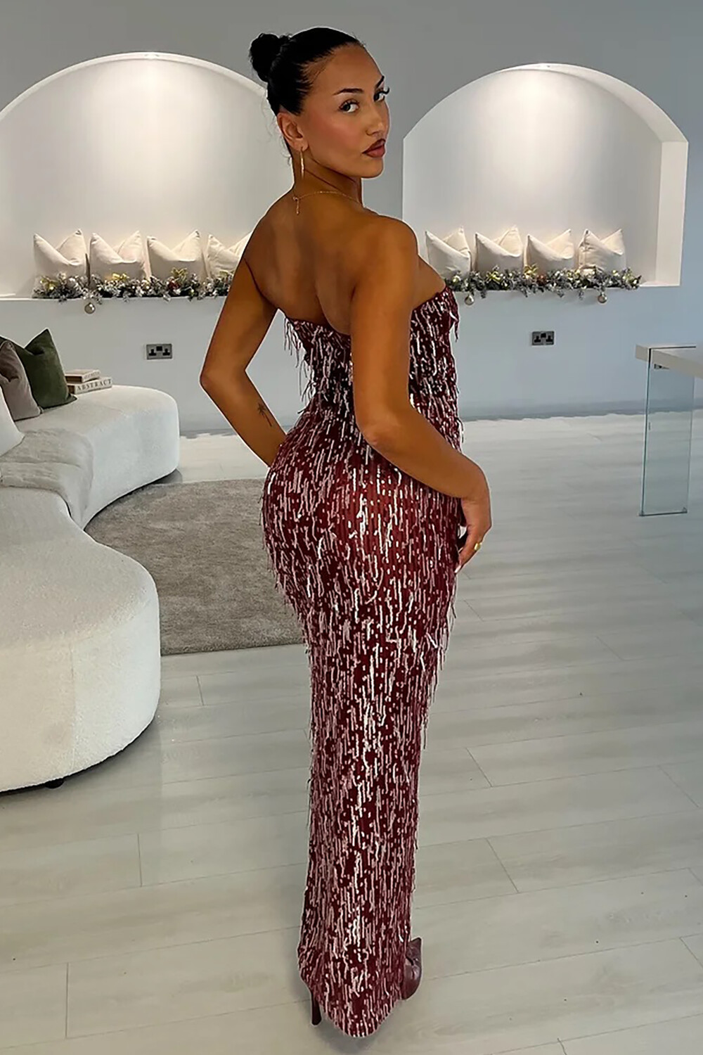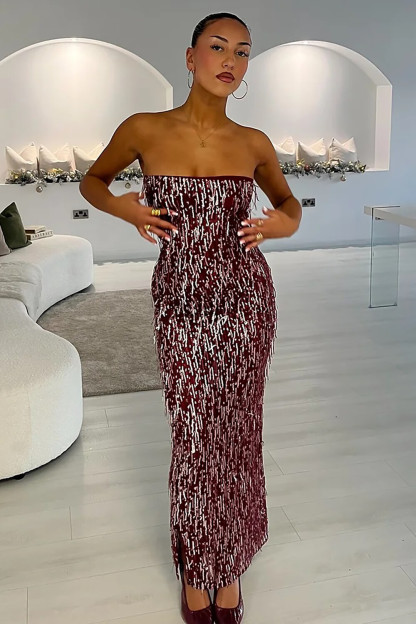 Sparkling Fringed Sequin Slim Fit Maxi Tube Dresses-Burgundy Pre Order