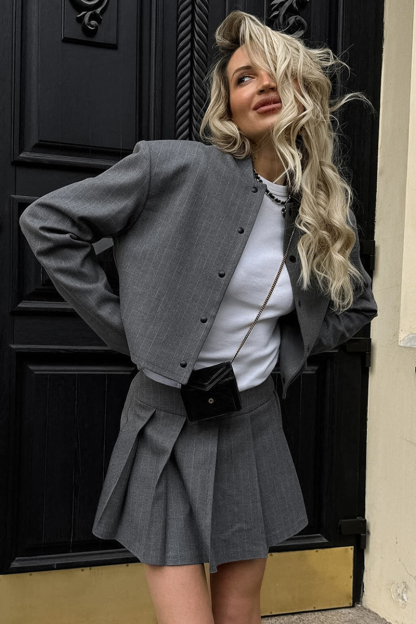 Striped Stand Collar Button Jacket Pleated Mini Skirt Matching Set-Gray