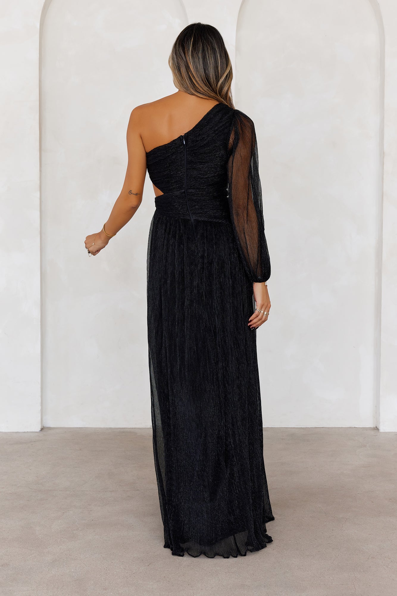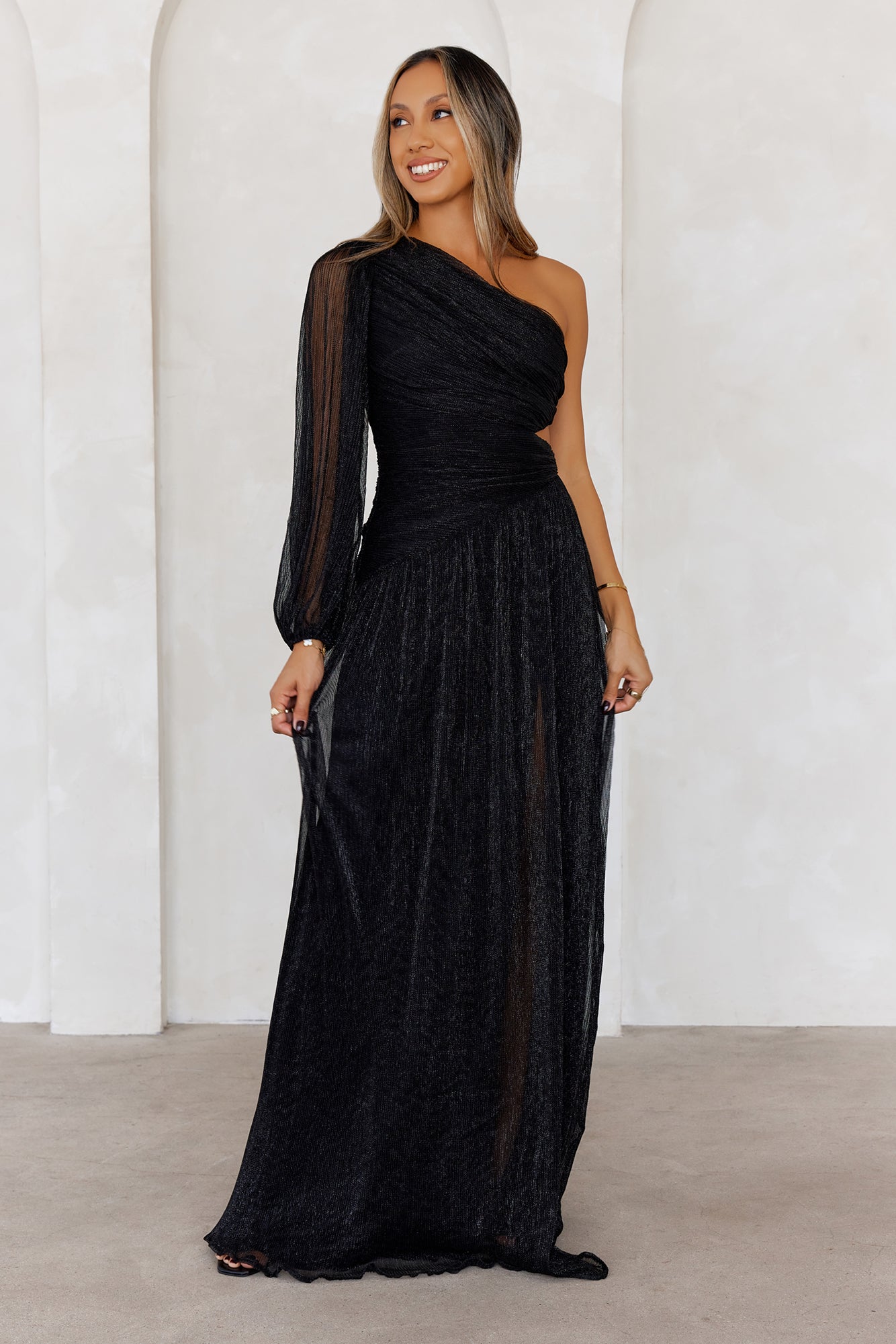 The style that'll make a statement. The Style Society One Shoulder Maxi Dress features a one-shoulder design. a cut-out to the waist and a shimmery fabrication we love. Style with heels!