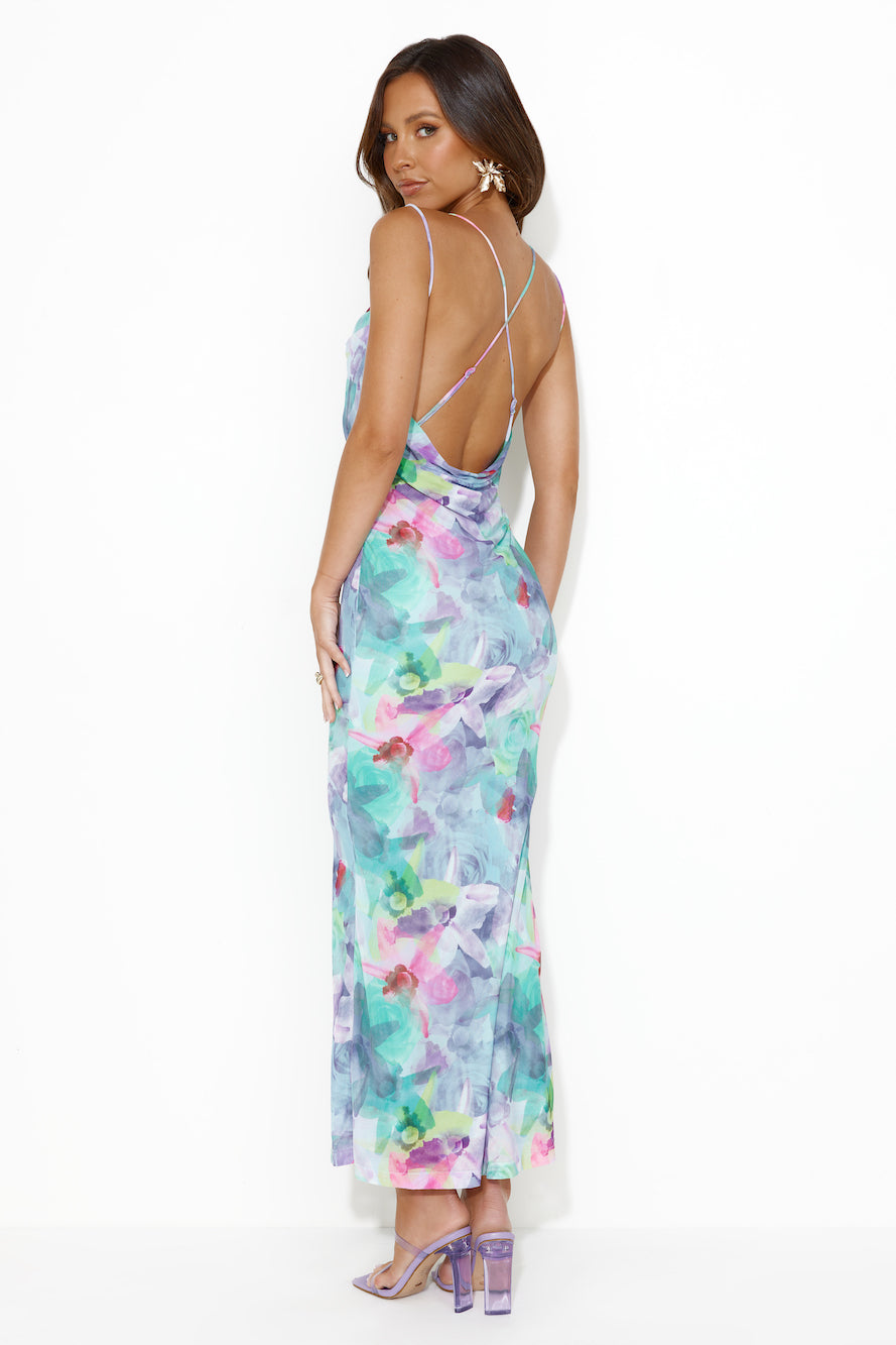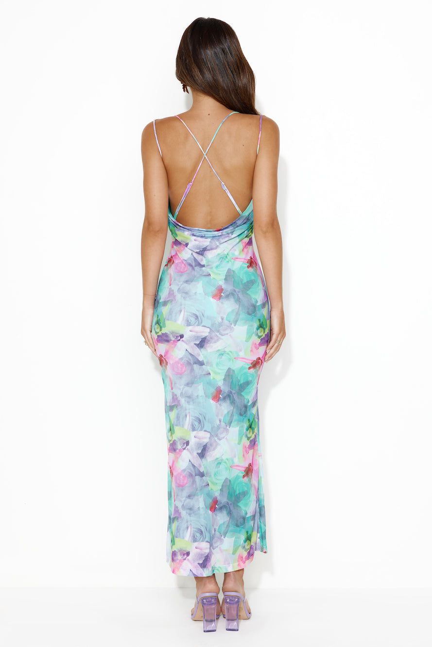 Bring the fun vibes in the Unlike You Mesh Maxi Dress. Featuring a gorgeous cowl neck design and bright patterned print. Style with heels and curls for all the compliments.