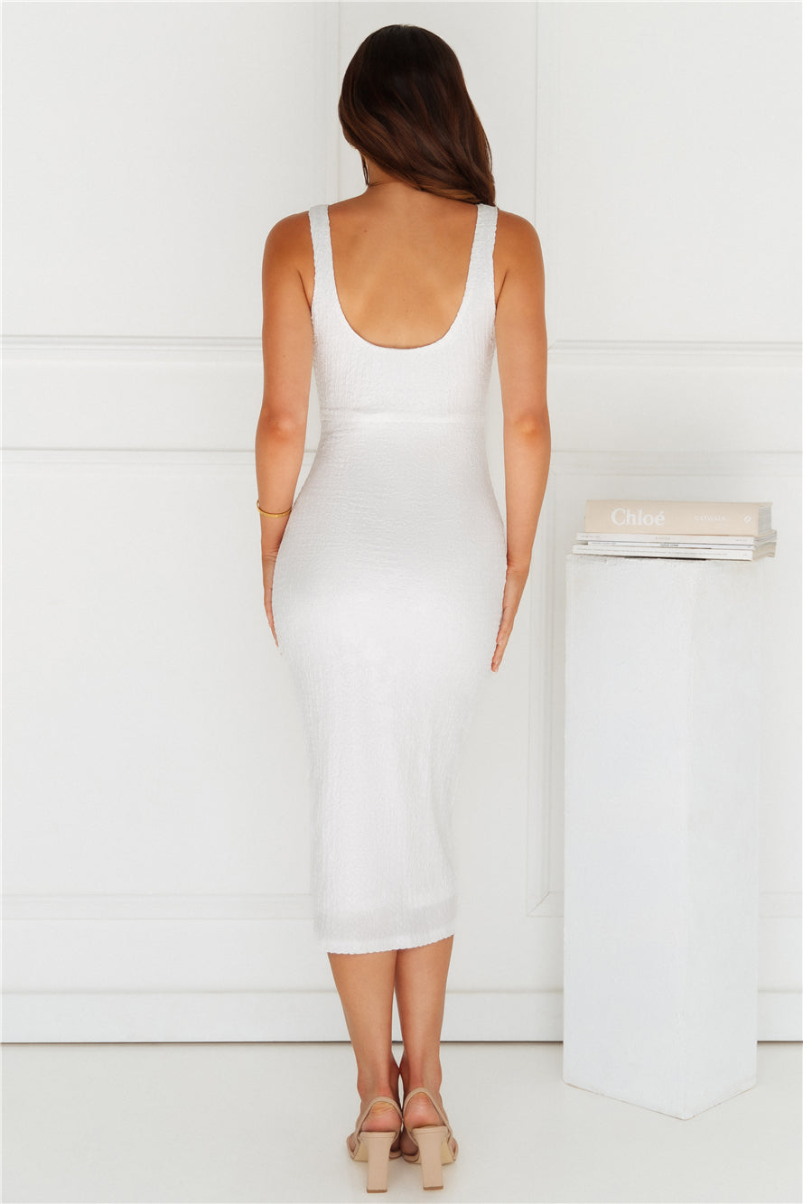Elevate your look with the Untamed Midi Dress. Featuring a textured fabrication with floral details and a scoop-back design. Style with heels for a 'fit we're loving.