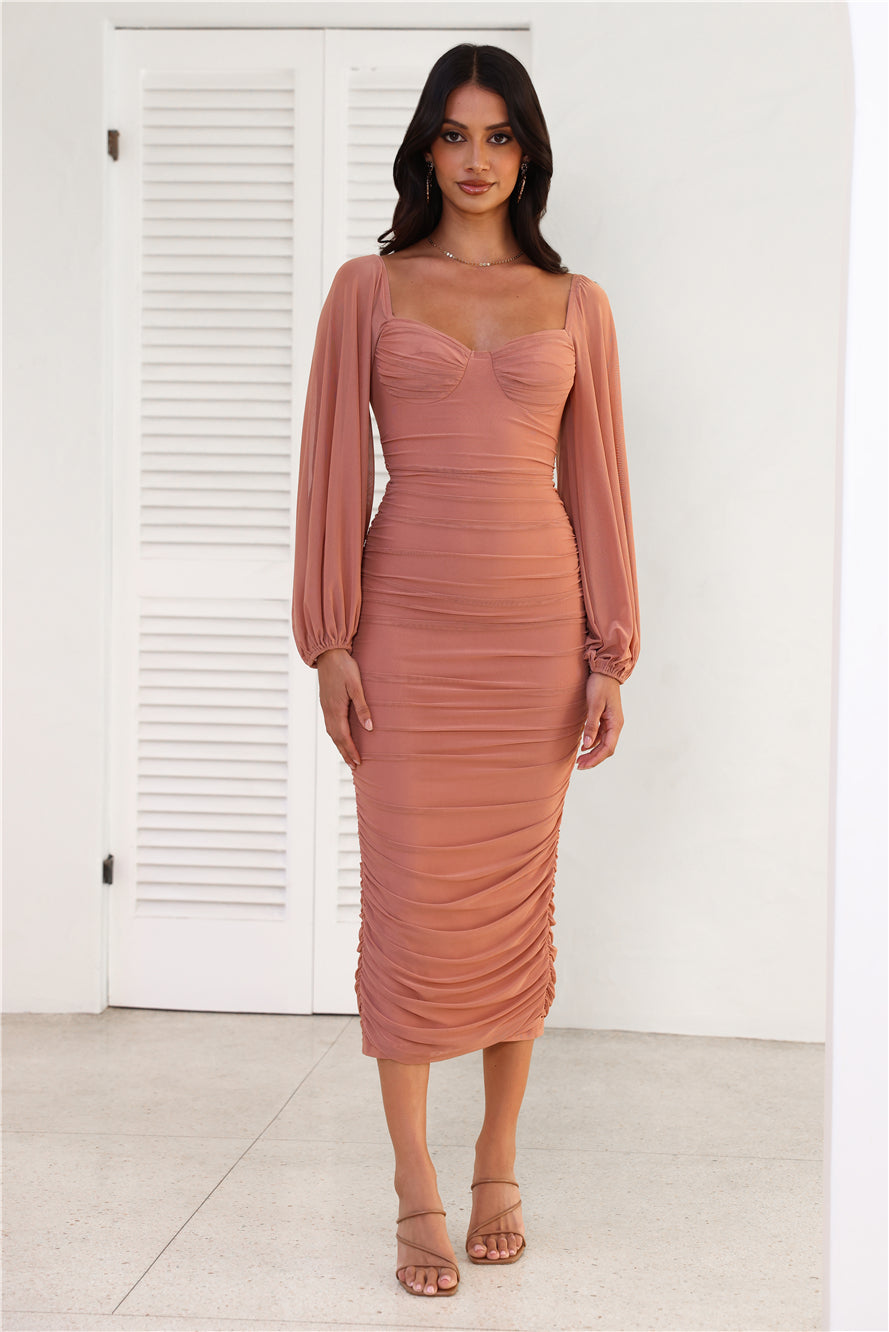 Move To The Music Long Sleeve Mesh Midi Dress Chocolate