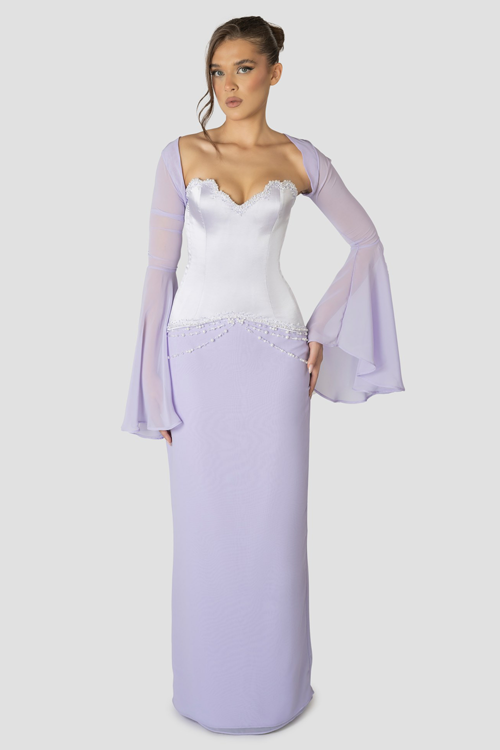 Bell Sleeve Corset Design Pearls Decor Chiffon Maxi Dresses-Purple Pre Order