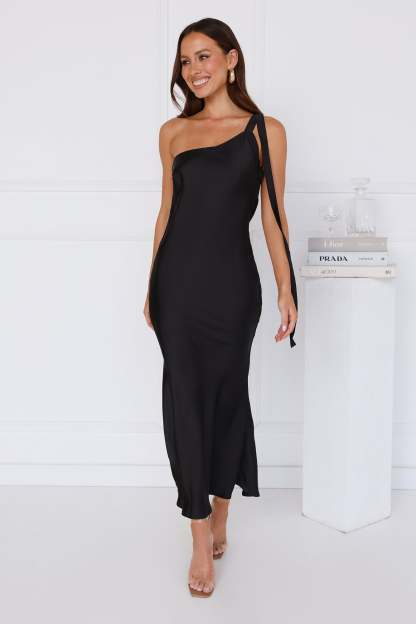 For a sleek and timeless silhouette. choose the Black Tie Ballroom One Shoulder Satin Maxi Dress. Featuring a silky satin design. a cowl back and an inner grip to have you feeling secure all night long. Style with heels to impress.