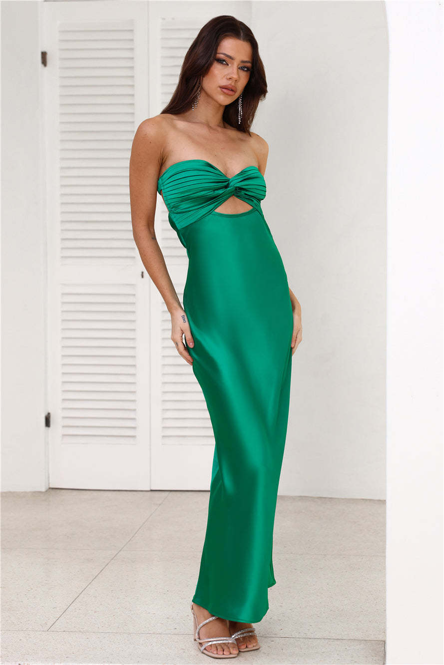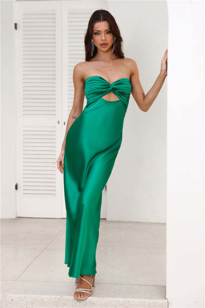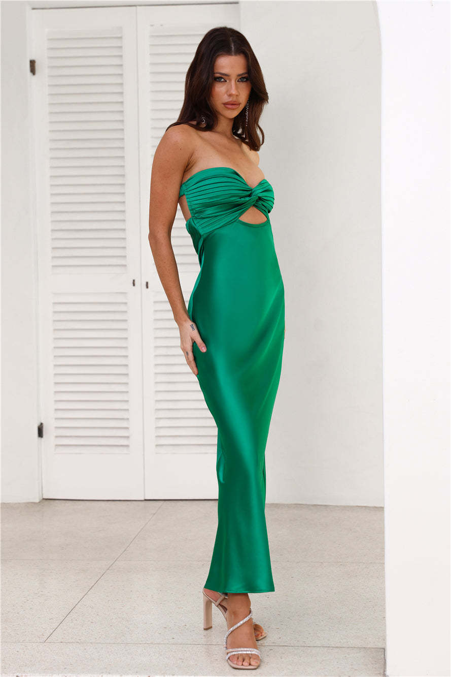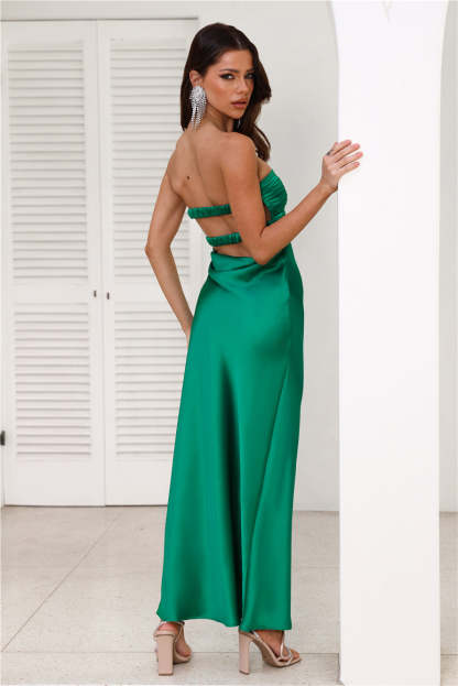 The world to you is a wonderful mystery. and we love that for you. Keep your Curious Heart alive with this satin dream. Featuring a sweetheart neckline with ruffled detail. a midriff cutout an open back with straps and a flowy skirt. Style yours with heels and curls.