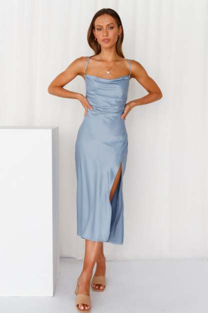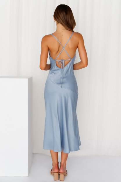 Our Drinks On Me Midi Dress screams vibes whenever you wear it! Exuding elegance from dusk to dawn. this sophisticated gown features a satin finish. a cowl neckline. and our favourite lace-up back. If you're attending the Spring Carnival or a wedding. we suggest wearing yours with a shaved block-heel. and pared-back adornments in sparkling golds.