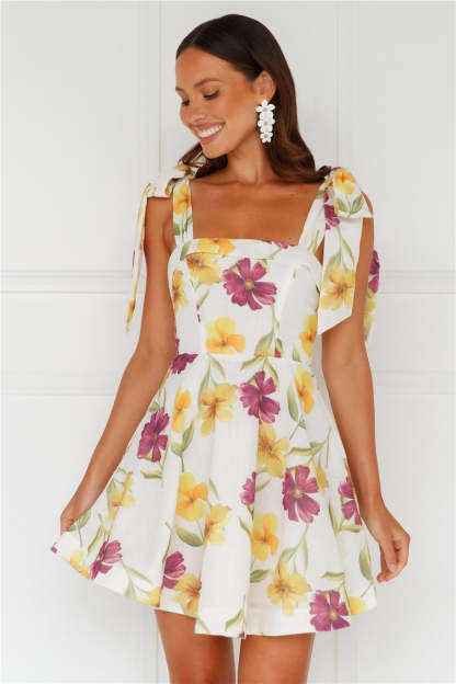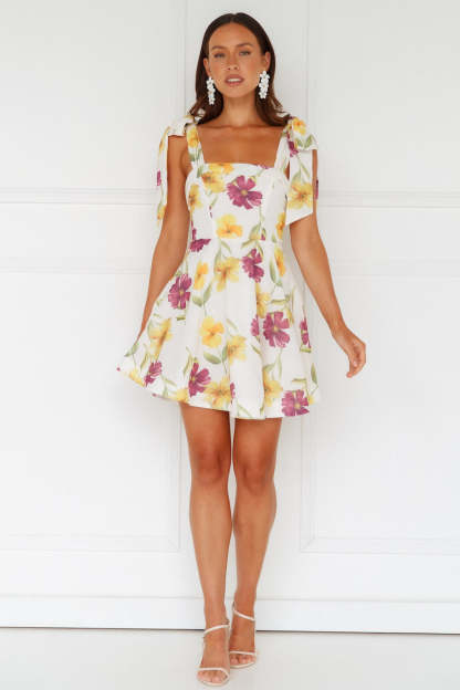 Switch up your style with this dreamy mini. The Floral Horizon Mini Dress features tie-up shoulder straps and a gorgeous flowy skirt. Style with sandals for a day of fun.