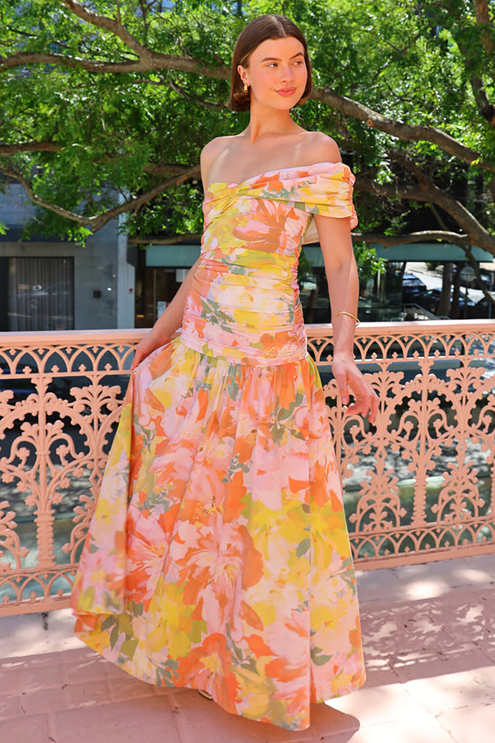 This off-shoulder maxi dress features a romantic silhouette. making it a standout choice for any event.