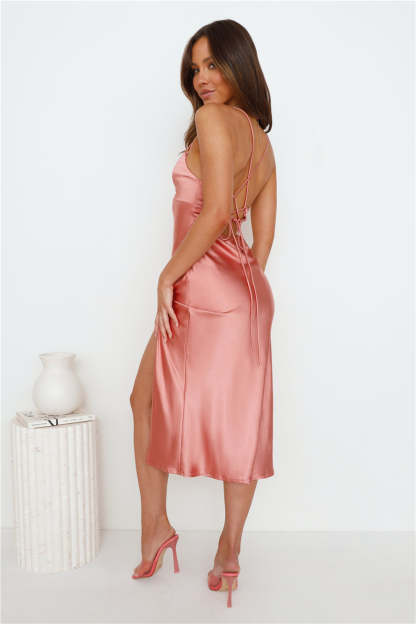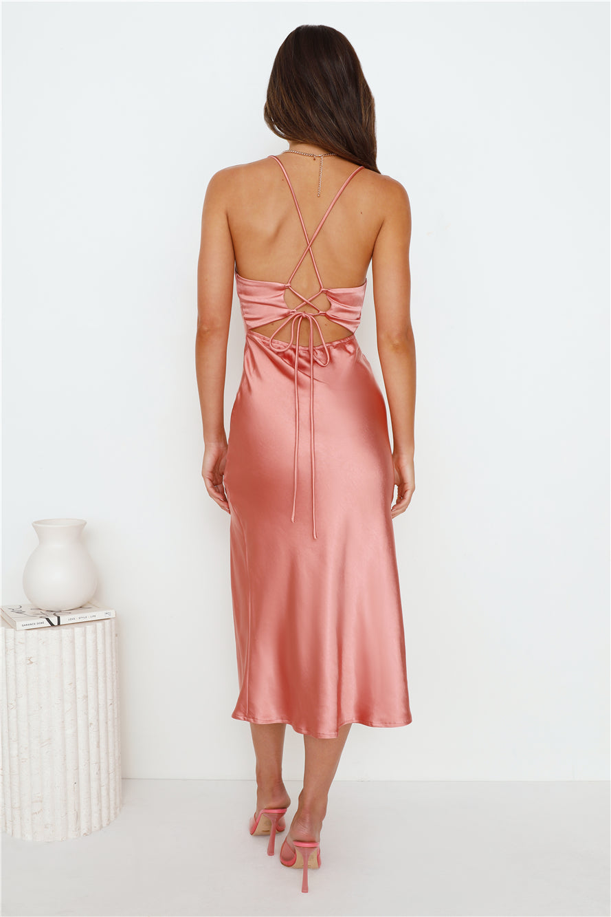 Get ready to stand out! The Formal Things Satin Midi Dress features a gorgeous silhouette and a crisscross tie-up back. Style with heels and curls for all the attention.