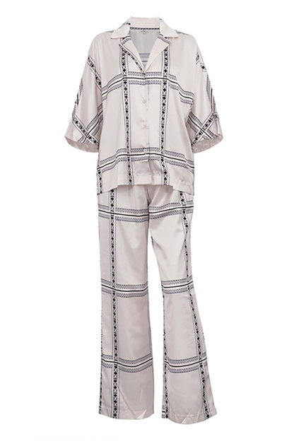 Geometric Print V Neck Loose Fit Blouse Wide Leg Pants Matching Set-Beige