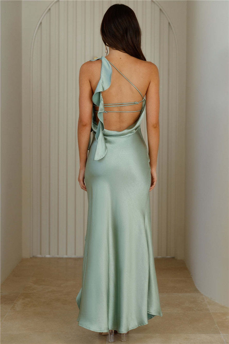 Glam Soirée Satin One Shoulder Maxi Dress Sage