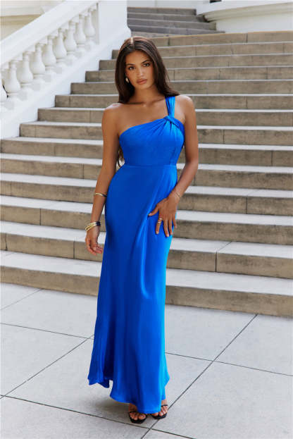 Graceful Elegance One Shoulder Satin Maxi Dress Cobalt