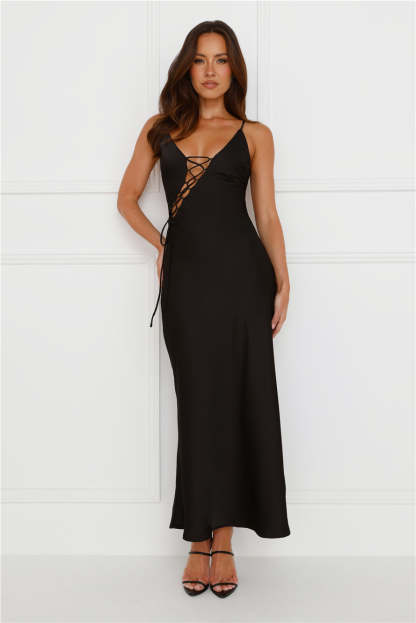 This is your reason to shop. lovely. You're going to feel amazing in the Hideaway Place Satin Maxi Dress. Featuring a statement lace-up detail to the top and a silky slip silhouette. Style with heels and you're ready to go!