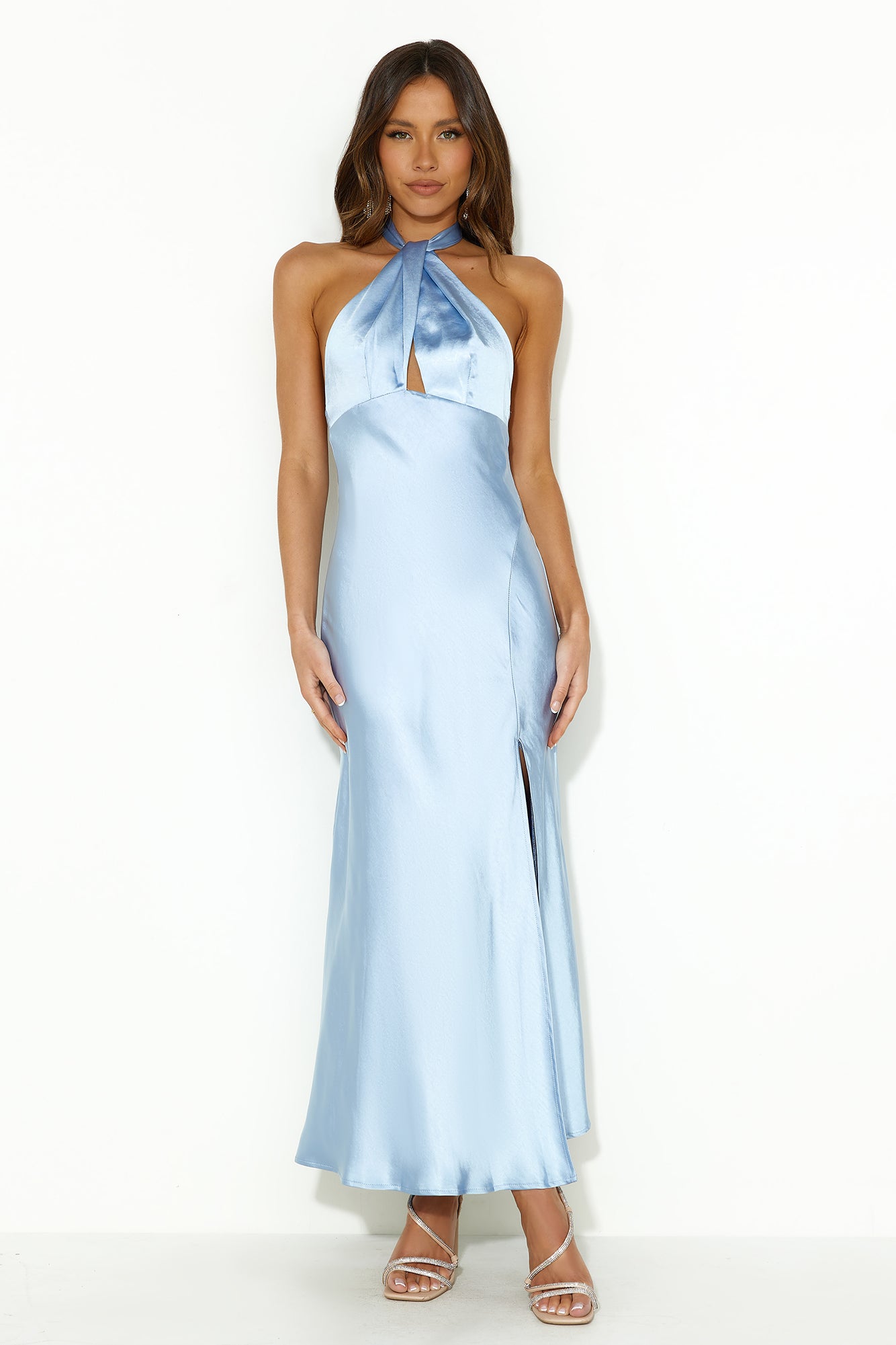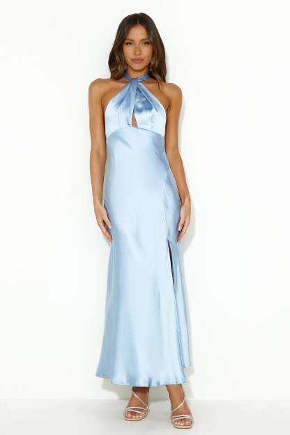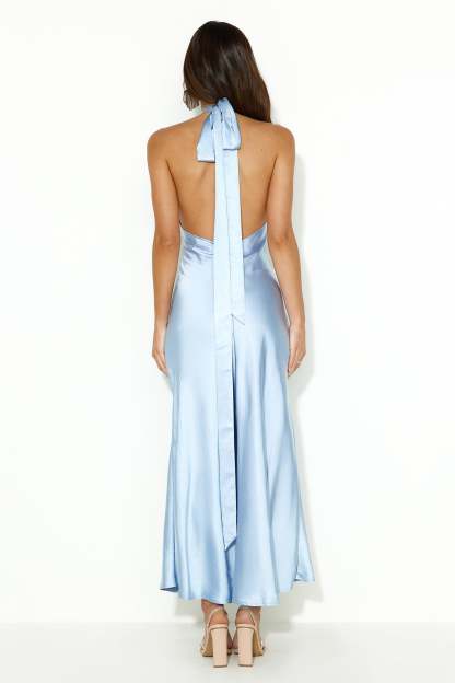 High Shine Nights Halter Satin Maxi Dress Blue