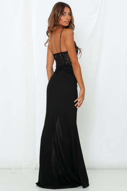 Strut your stuff in the I Come Alive Maxi dress. Featuring a partly sheer lace bodice. a v neckline and thin straps. this style let's you show off a little va-va-voom with a thigh high split.