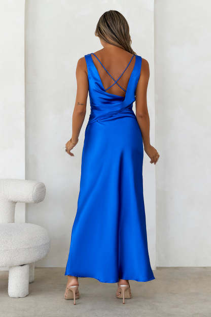 Walk in with class. girl! The Indigo Fields Satin Maxi Dress features a gorgeous V-neck with a cowl back and crisscross design. Style with heels for your fancy event.