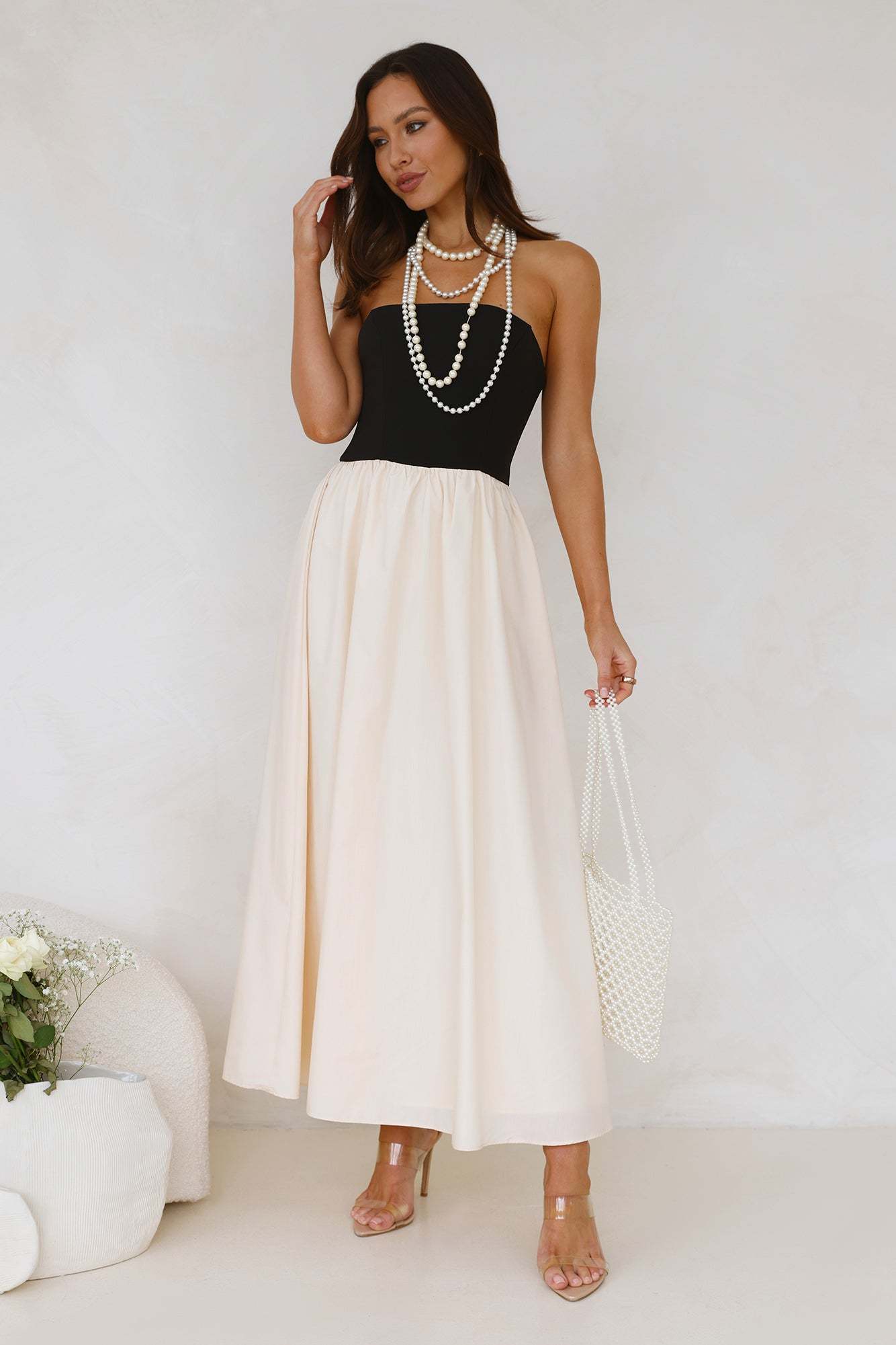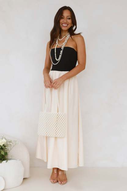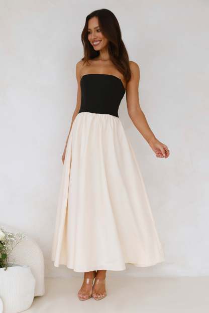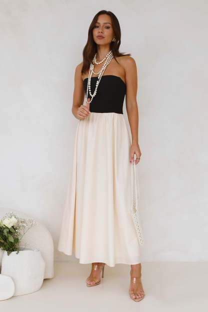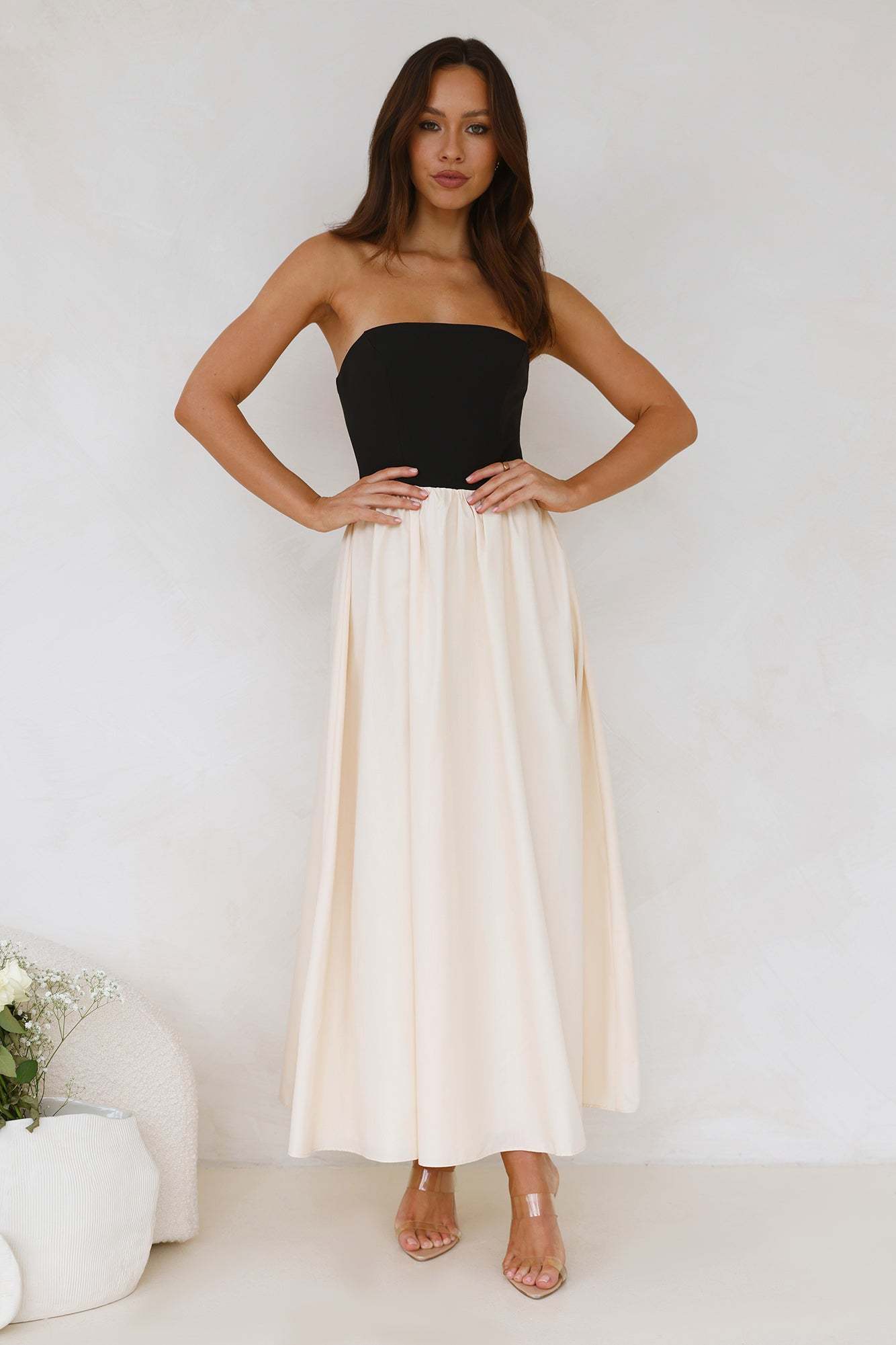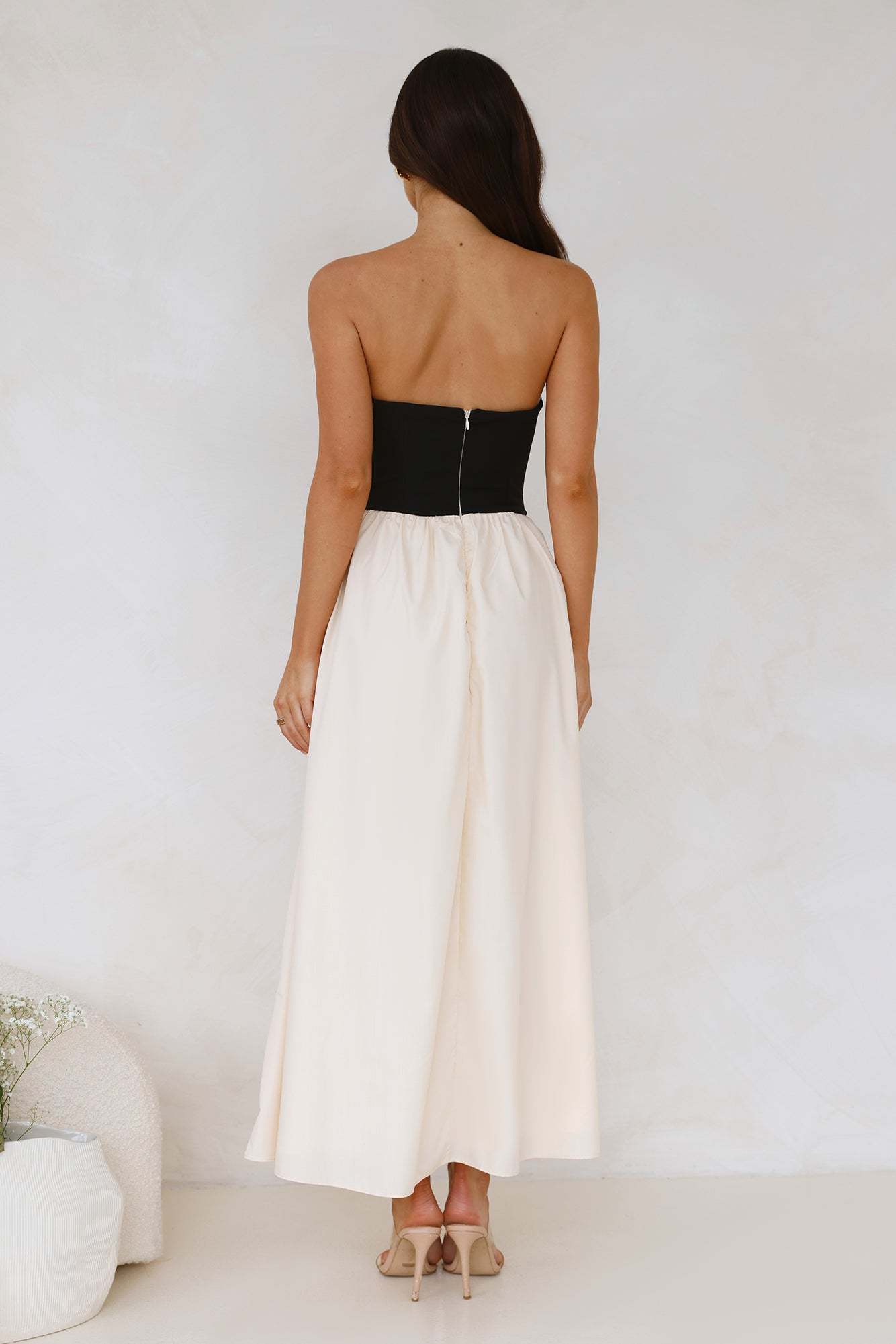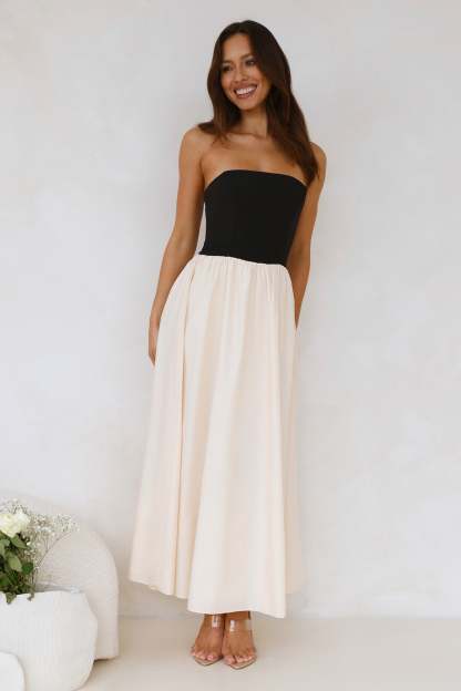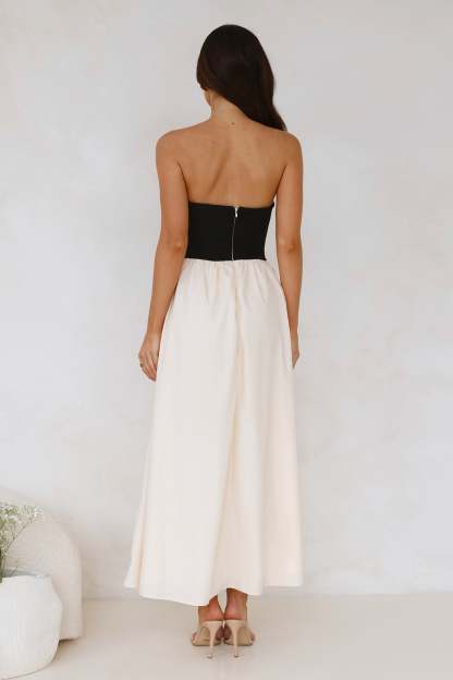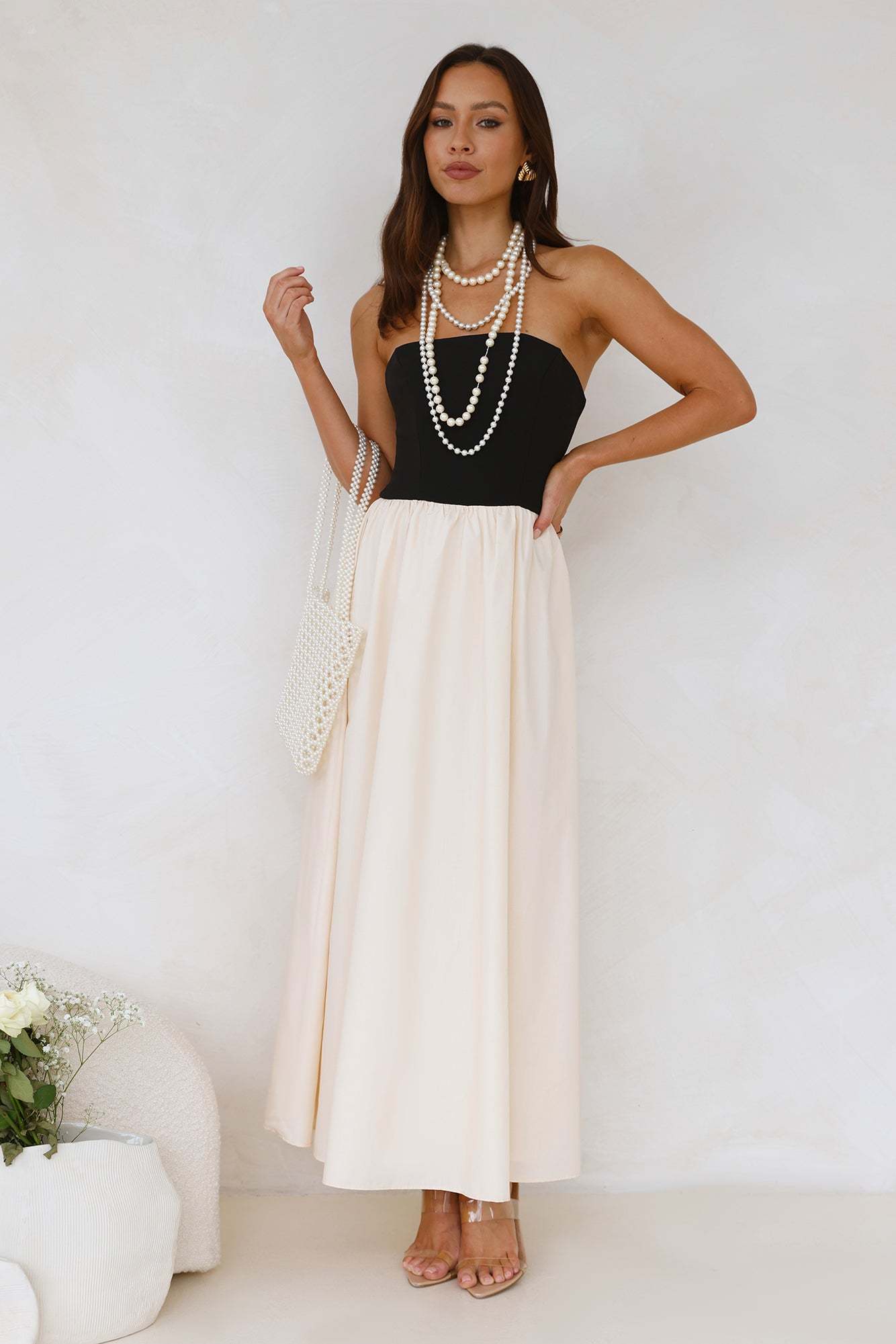 Enter a world of pure sophistication with the Lights Low Strapless Maxi Dress. Featuring a contrast design. boning to the top for structure and a flowy skirt. Style with heels and curls for a dreamy 'fit.