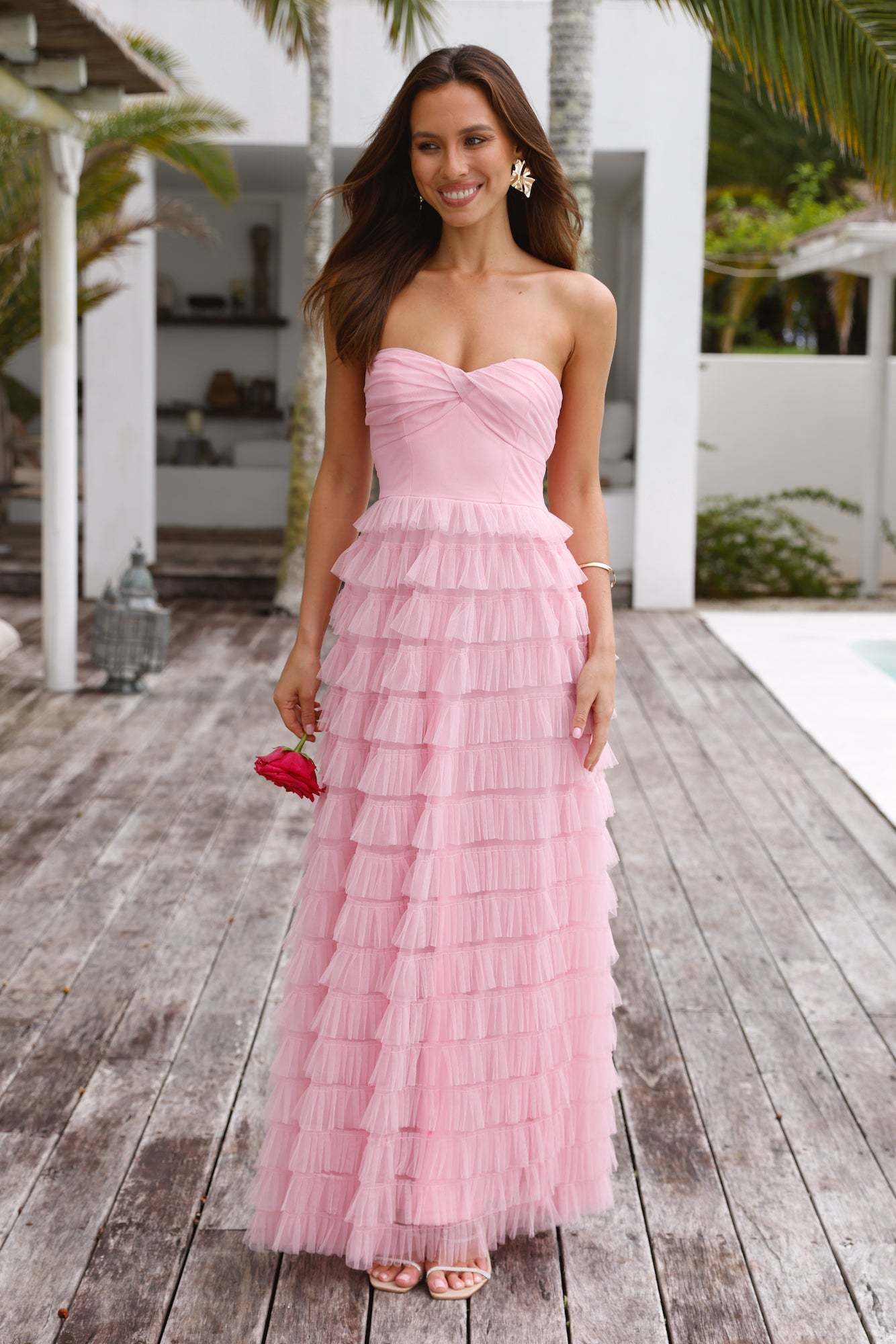 Romanticise every moment in the Lovers In Paris Strapless Tulle Maxi Dress. Featuring a gorgeous tiered frill skirt. twist detail to the top and an inner grip. Style with heels for an unforgettable 'fit.