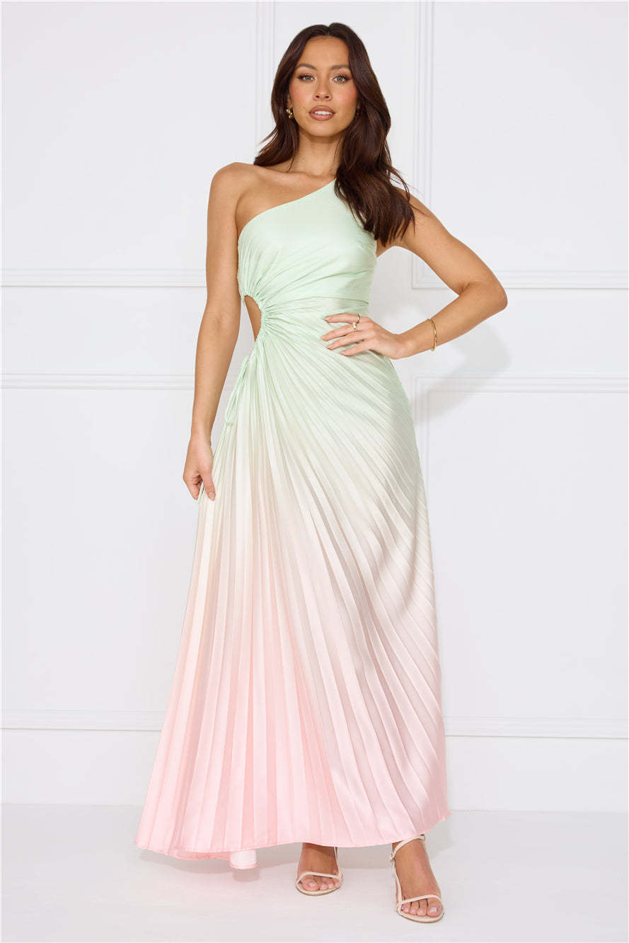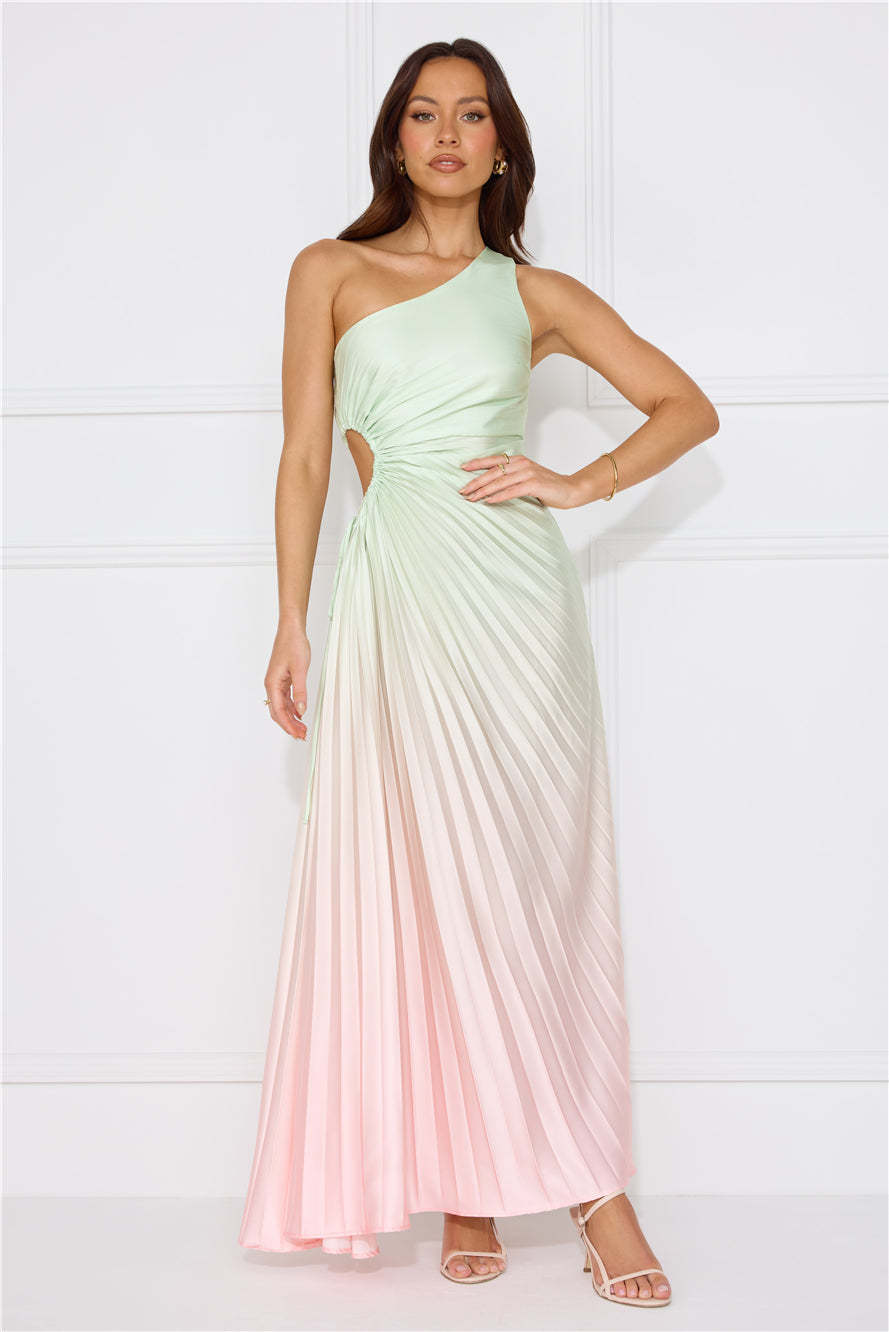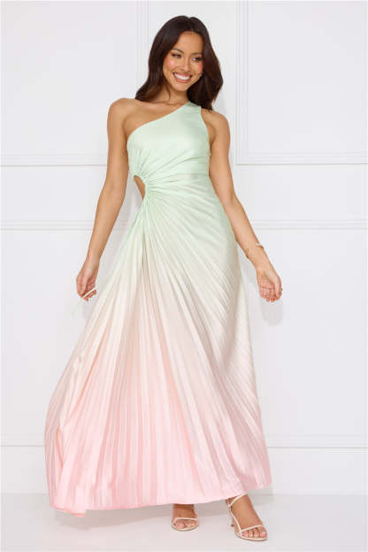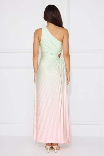Be obsessed with your 'fit in the Matcha For You One Shoulder Satin Maxi Dress. Featuring a cutout with a drawstring to the waist. a pleated design and ombre shades. Style with heels for a party!