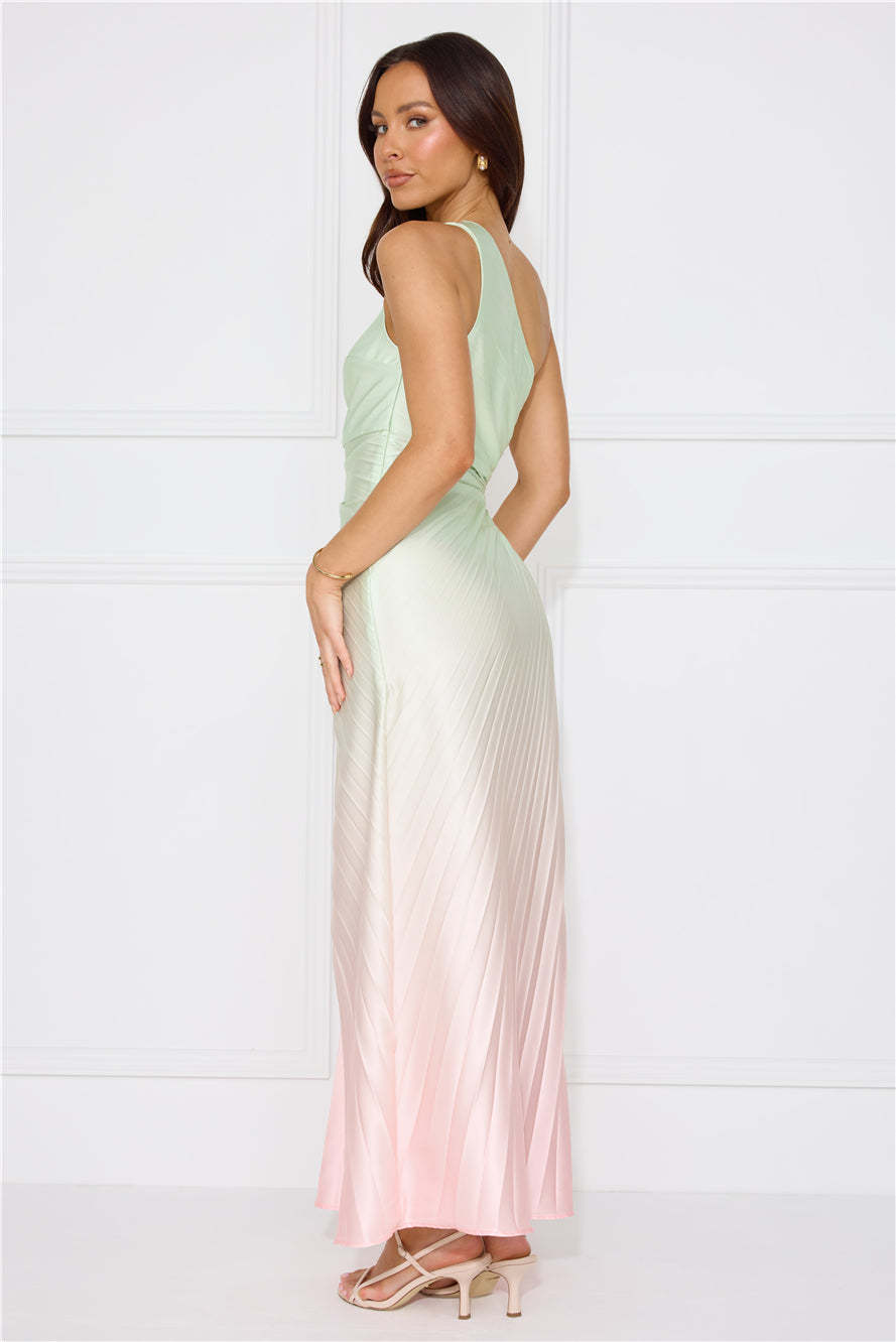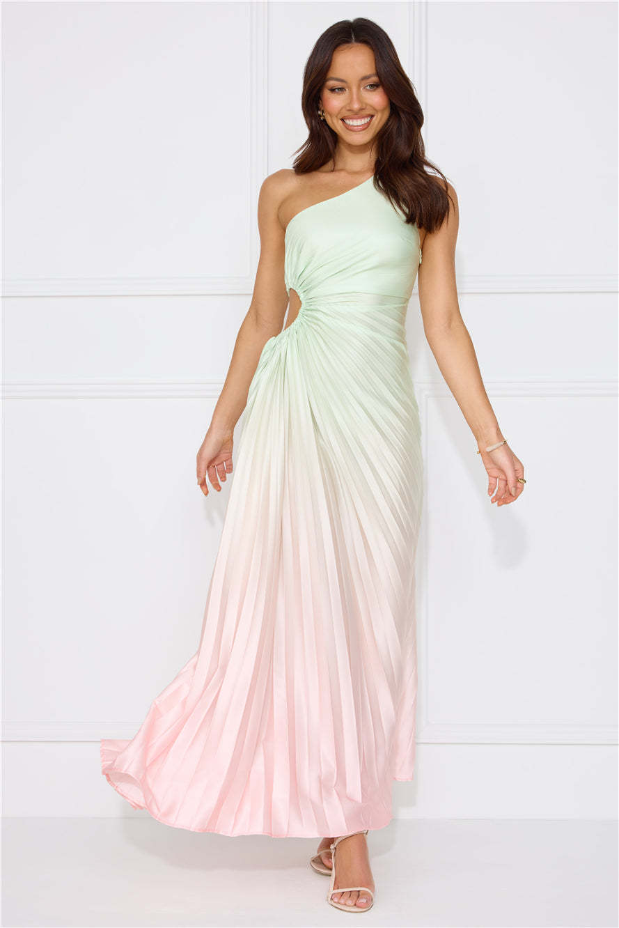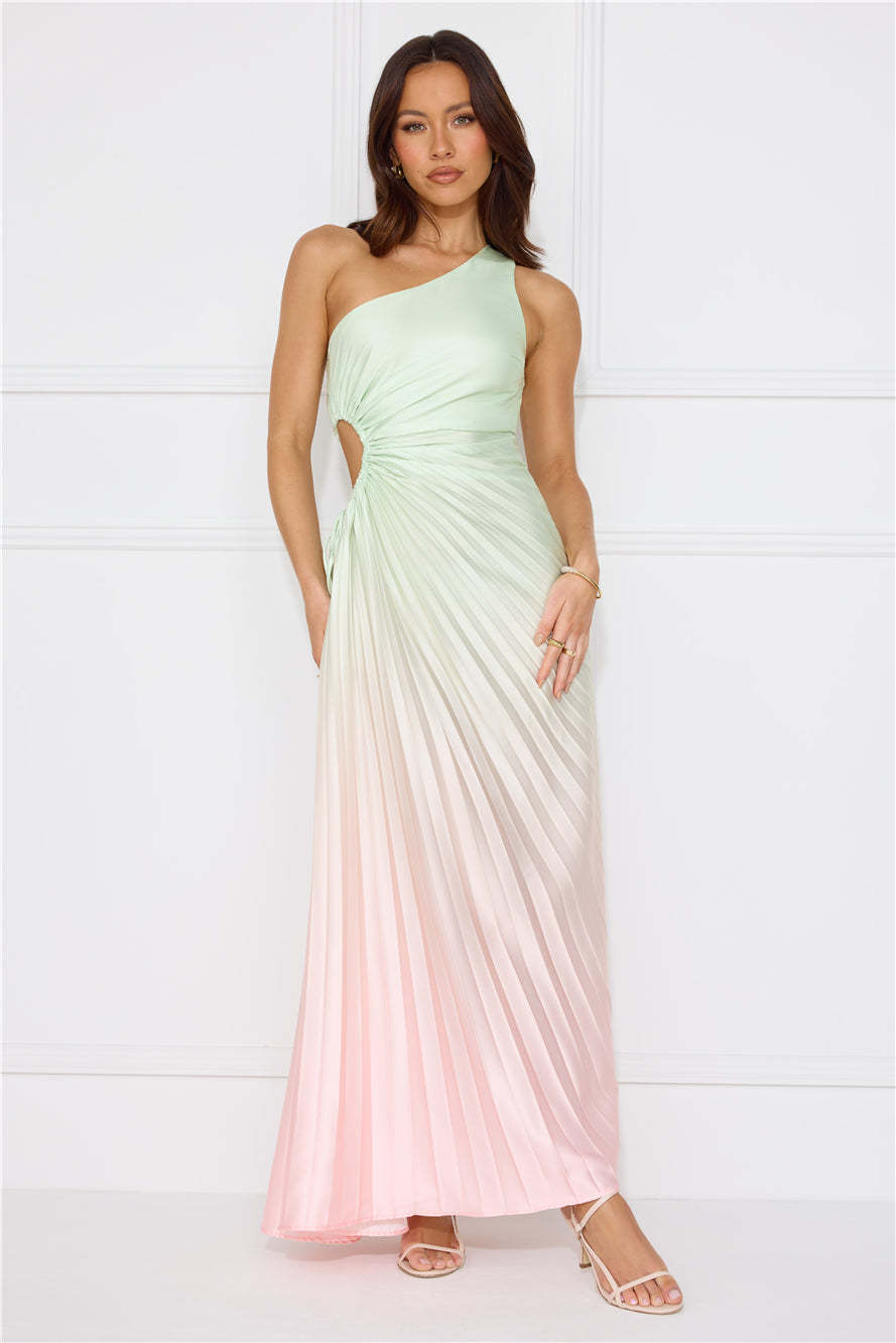 Be obsessed with your 'fit in the Matcha For You One Shoulder Satin Maxi Dress. Featuring a cutout with a drawstring to the waist. a pleated design and ombre shades. Style with heels for a party!