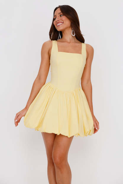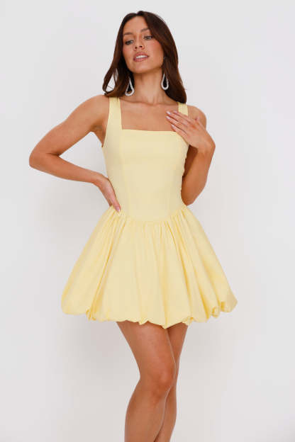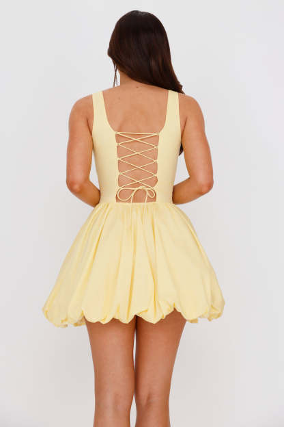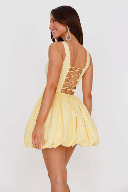 Designed for the best moments. the Midsummer Dream Bubble Mini Dress features a crisscross tie-up back and the most-wanted bubble skirt hem. Style with heels and all your fab vibes.