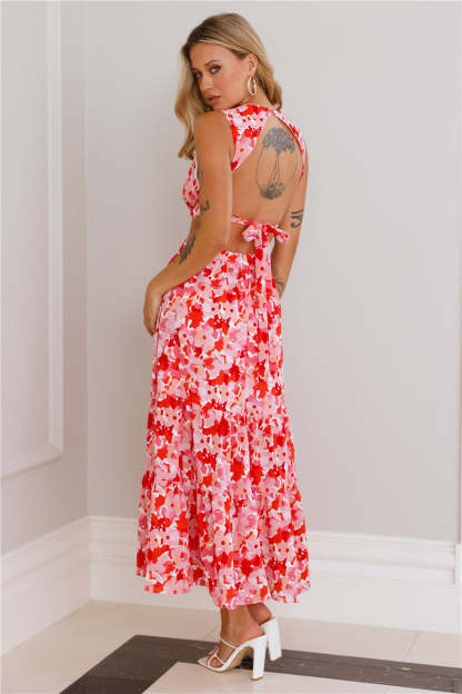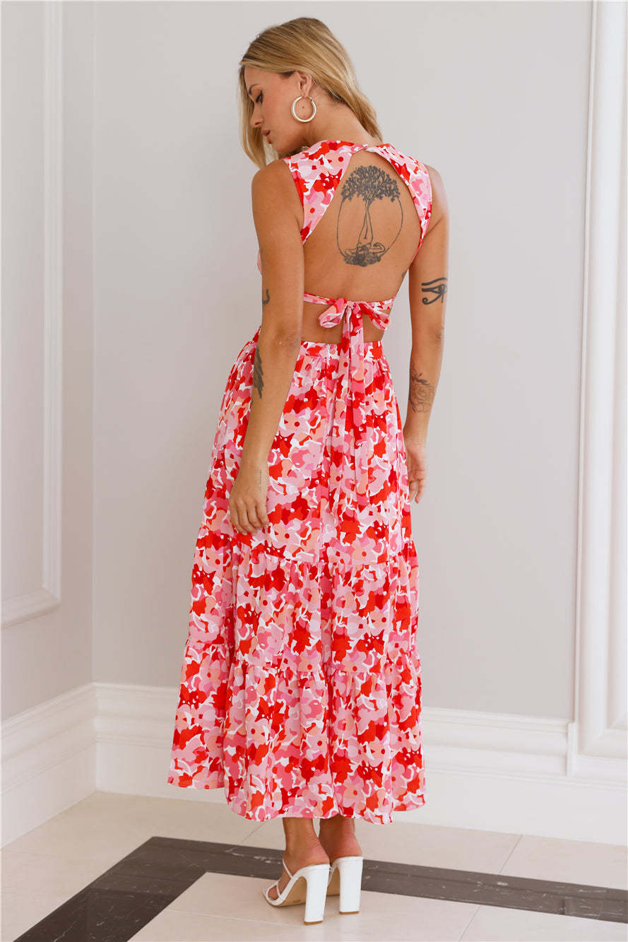 You'll be getting the likes in this dress. girl. The Lover Looks Maxi Dress features a tie up back and a flowy skirt. Style with heels and curls for compliments.