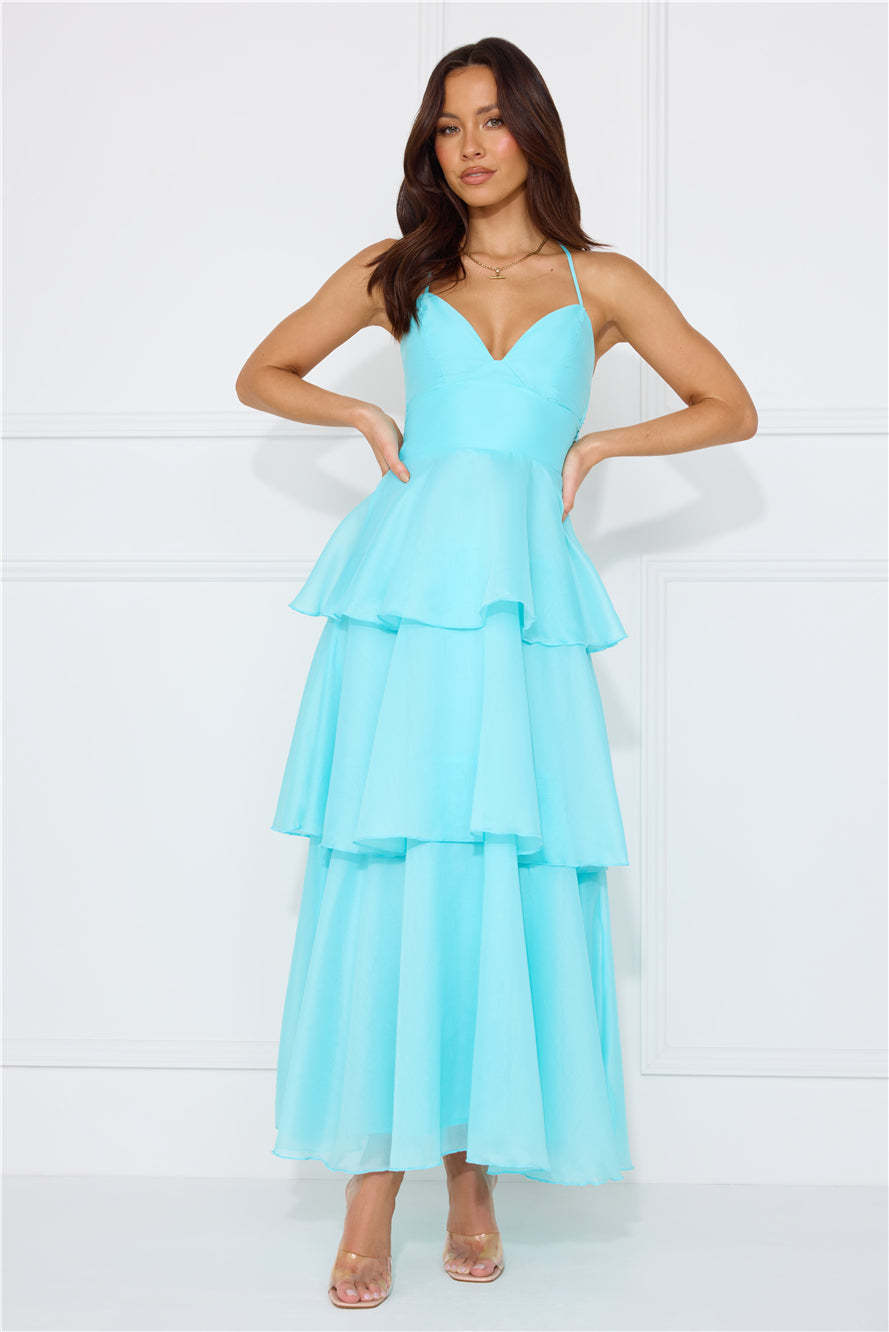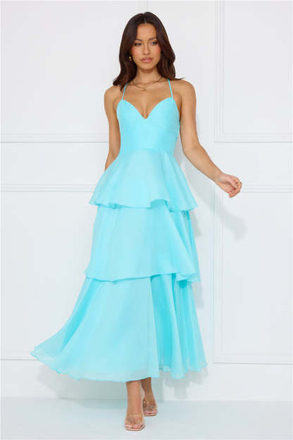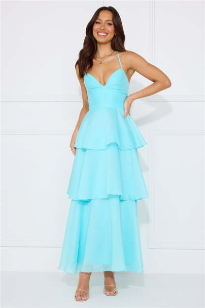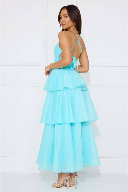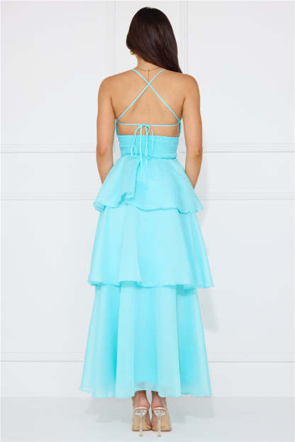 Enter the event and impress! The Mysterious Beauty Maxi Dress features an extravagant tiered flowy skirt and a crisscross back tie design. Style with heels and curls for all the attention.