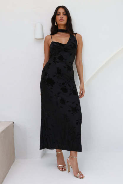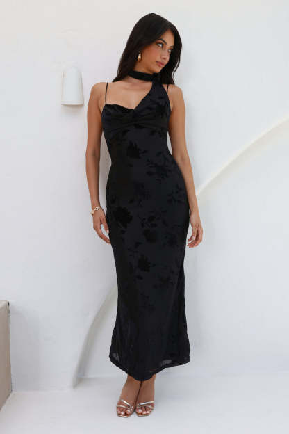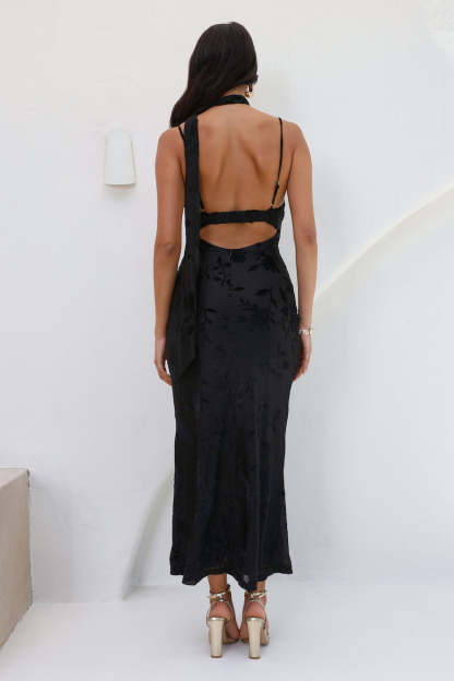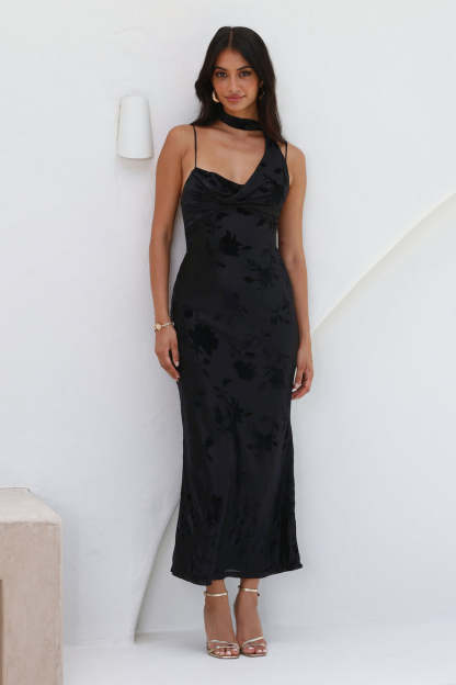 Be seen and admired in the Mysterious Lover Maxi Dress. Featuring a gorgeous neck wrap and an elastic back. Style with heels and curls for all the attention.