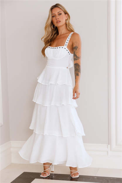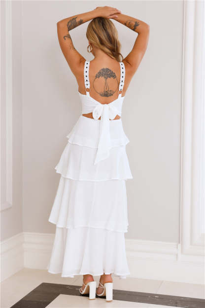 A gorgeous style taking you from a fancy brunch to sunset dinners. The Ocean Spray Maxi Dress features an embroidered neckline with black ribbon. a tiered frill skirt and a tie-up back. Style with sandals for a dreamy 'fit.