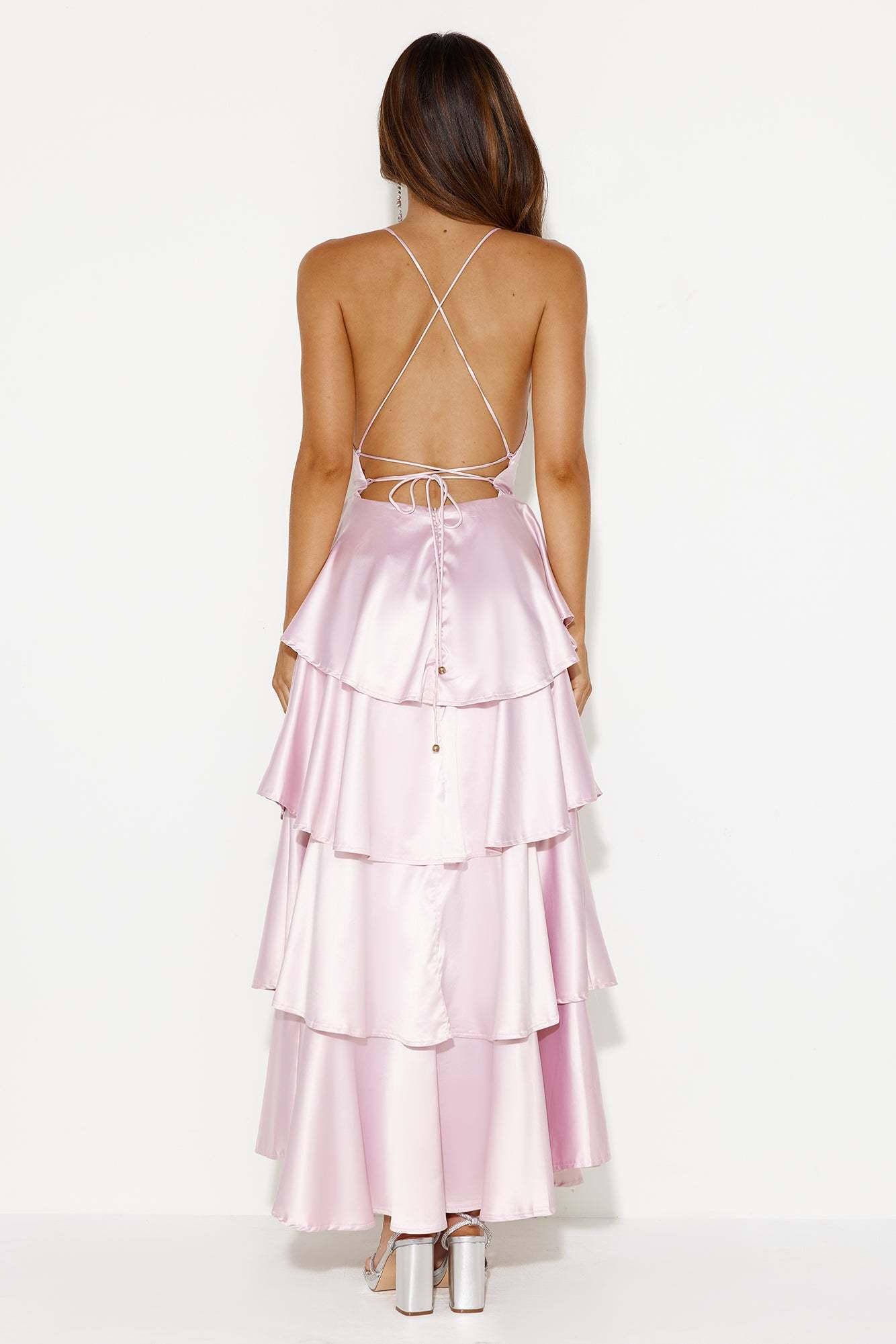 Extra girls. this is the dress for you! The Party Of The Year Satin Maxi Dress features a gorgeous tiered frill skirt with a tie-up back. Style with heels for a queen-worthy 'fit.