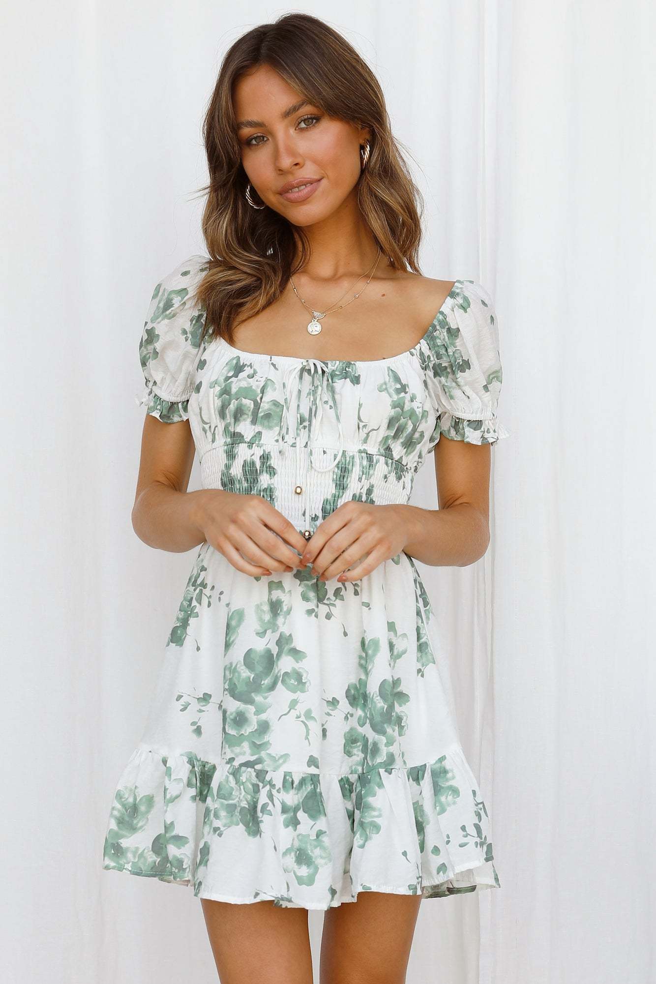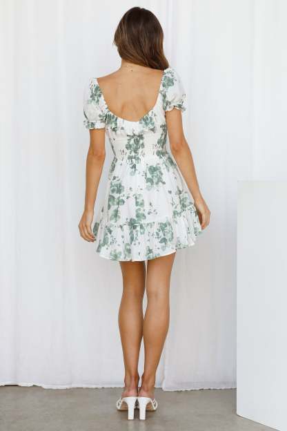 - Floral printed mini dress.