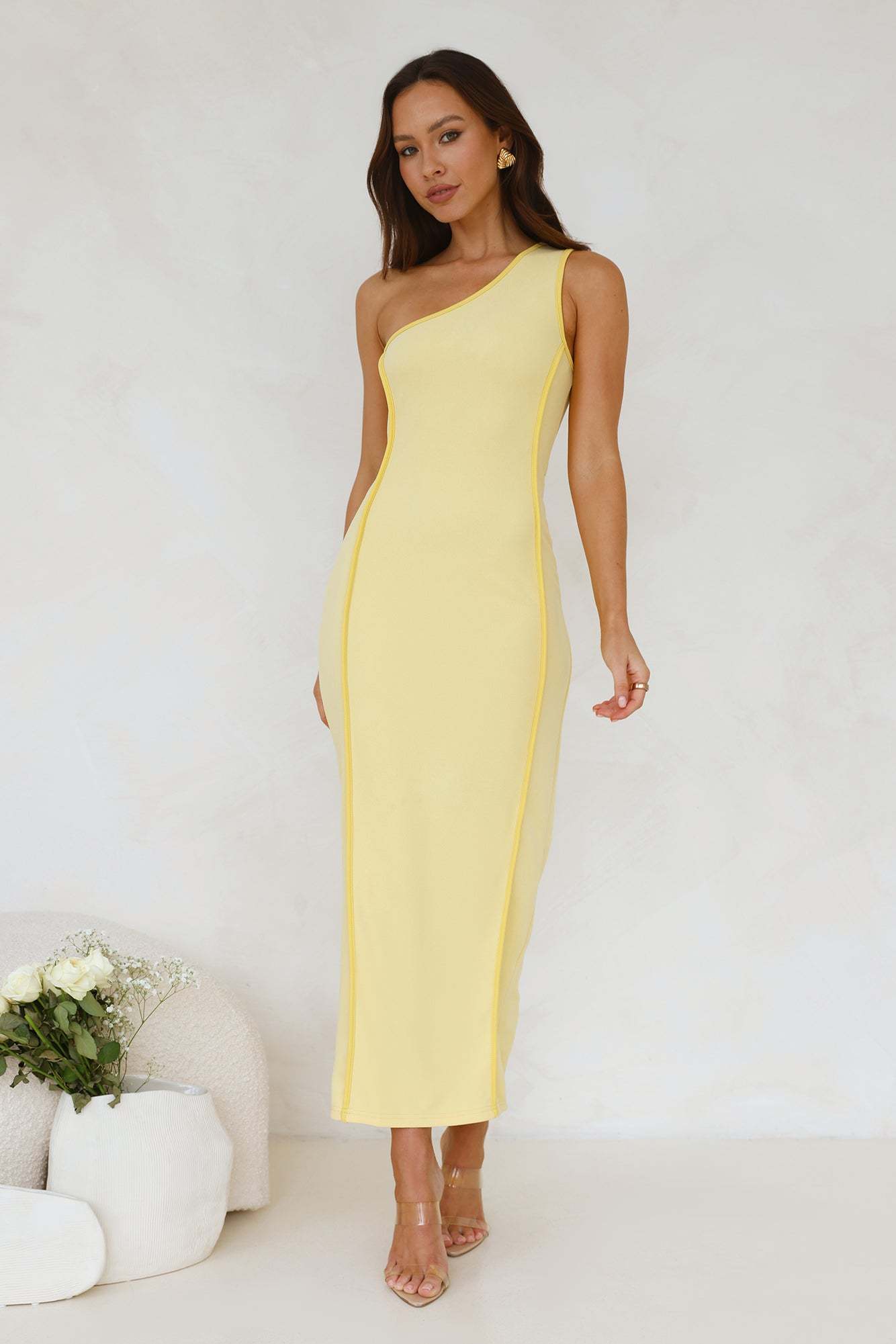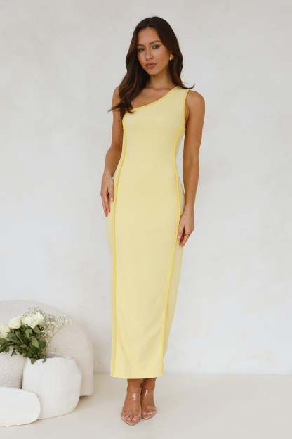 Introducing the Piece Of Paradise One Shoulder Maxi Dress. Featuring a contrast yellow trim and a bodycon fit with a vent extension. Style with heels for all the likes.