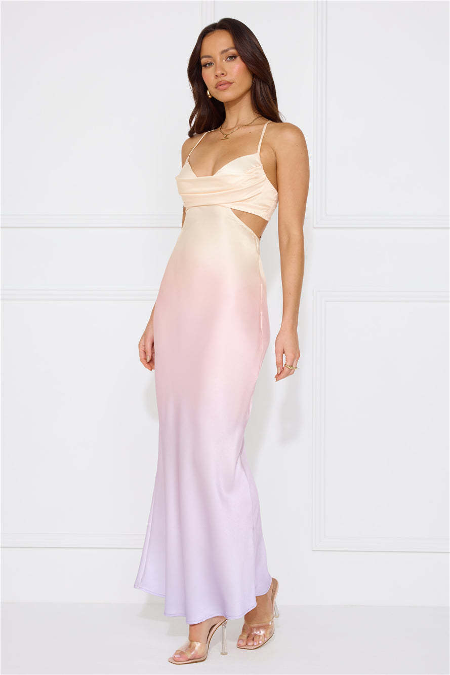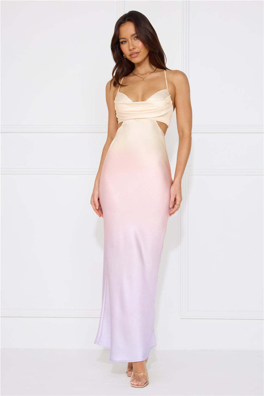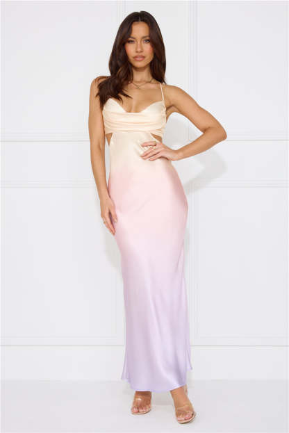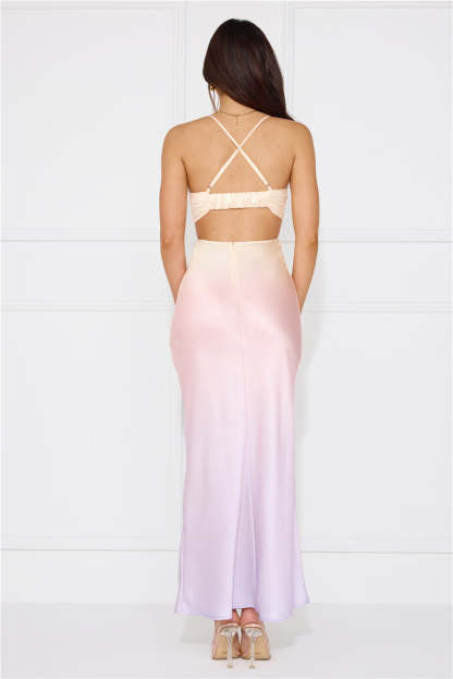 Feel gorgeous in the Rainbow Glare Satin Maxi Dress. Featuring an elasticated strap to the back. a cut-out to the waist and back and a dreamy ombre hue. Style with heels for the cutest look.