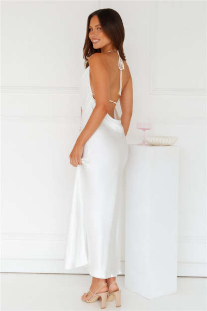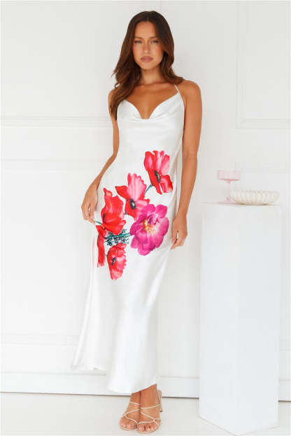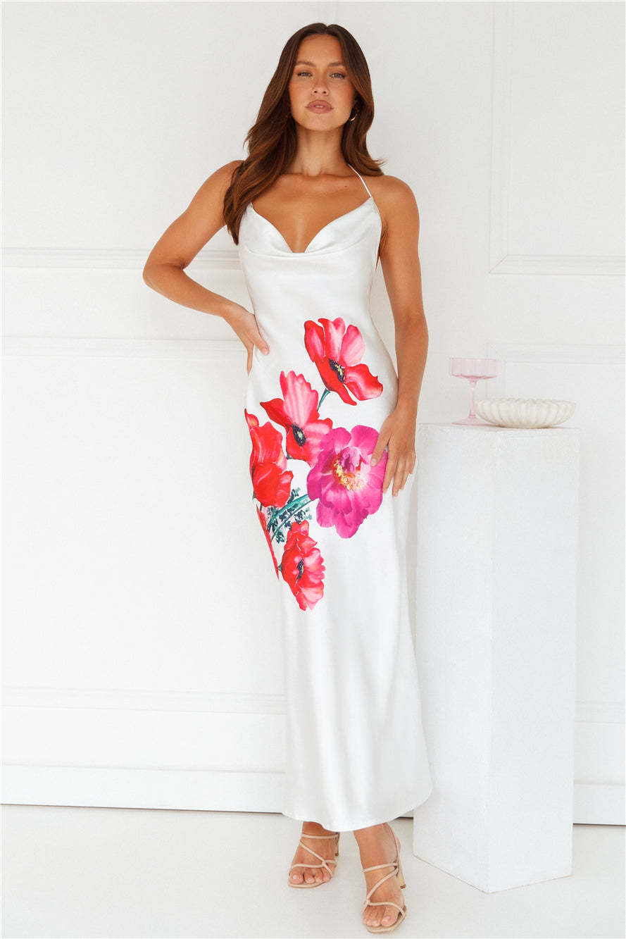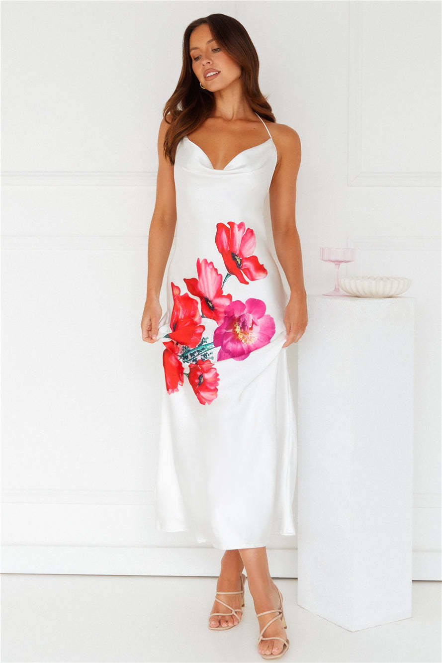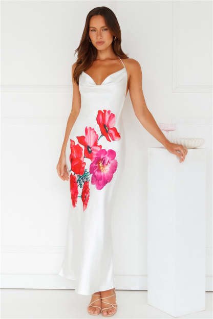 Love the 'fit you're in with the Rebellious Rose Halter Satin Maxi Dress. Featuring a gorgeous silky satin silhouette. a cowl neck and back. and a vibrant floral print to the front. Style with heels and curls!