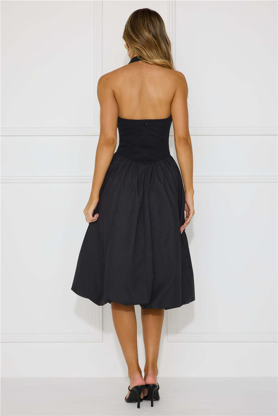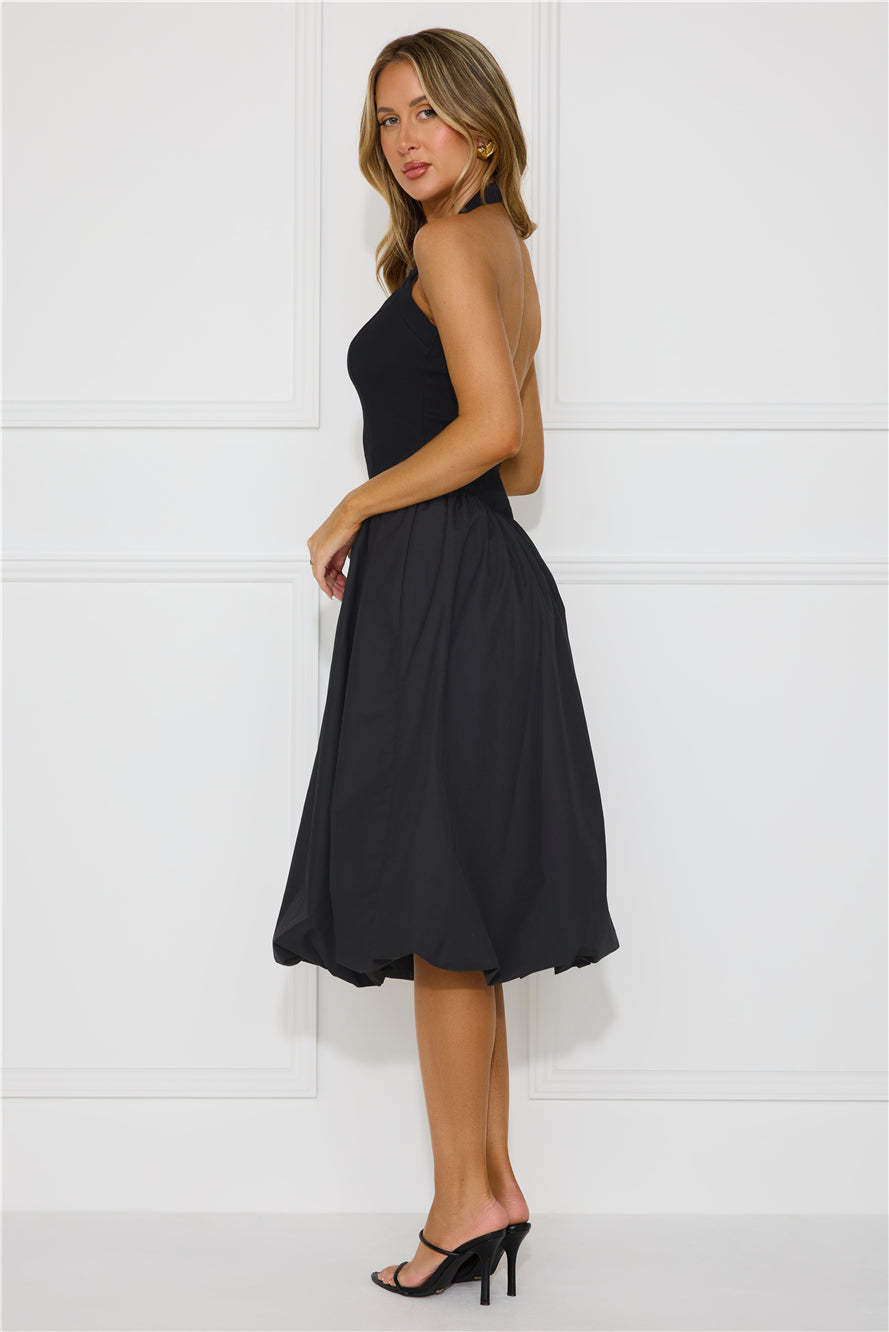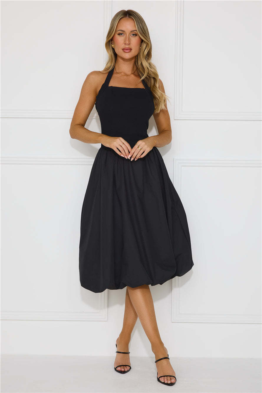Dress to impress in the Rising Stars Halter Bubble Midi Dress. Featuring a ribbed top. halterneck design and the trending bubble hem skirt. Style with heels and curls.
