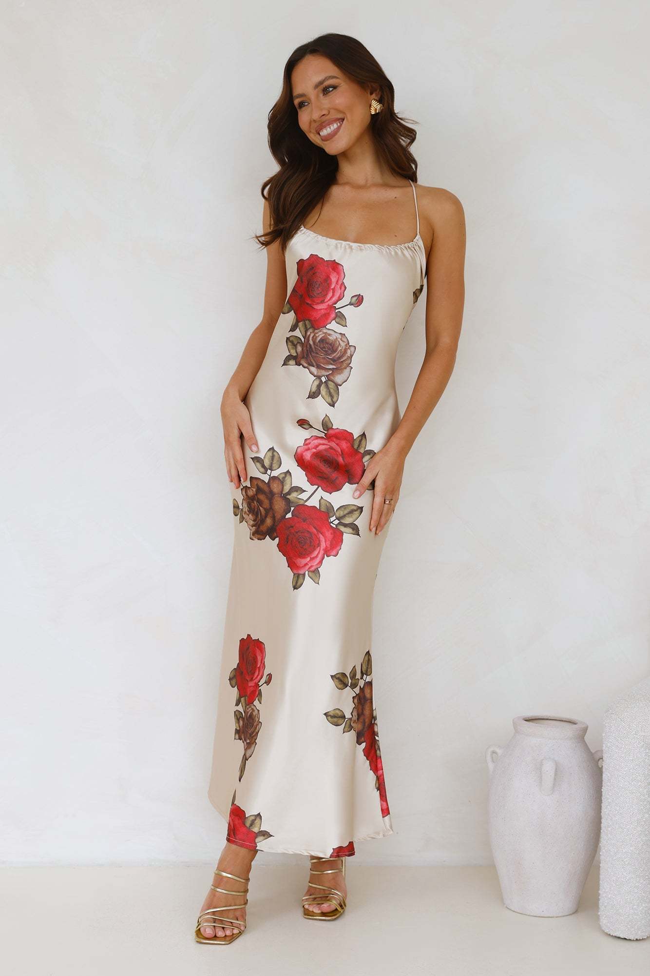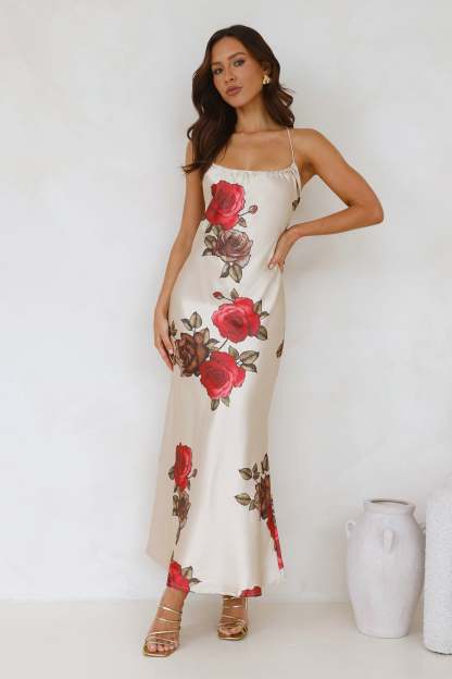 Designed for special occasions. The Rose Between Thorns Satin Maxi Dress features a silky silhouette. a crisscross tie-up back and a gorgeous print. Style with heels and curls.