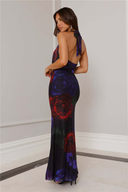 Made for all your fancy events. The RUNAWAY Zoey Maxi Dress features a cowl neckline with a halter tie and an open back. Style with heels for all the attention.