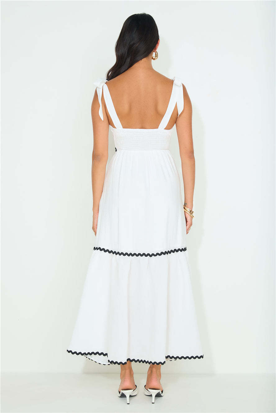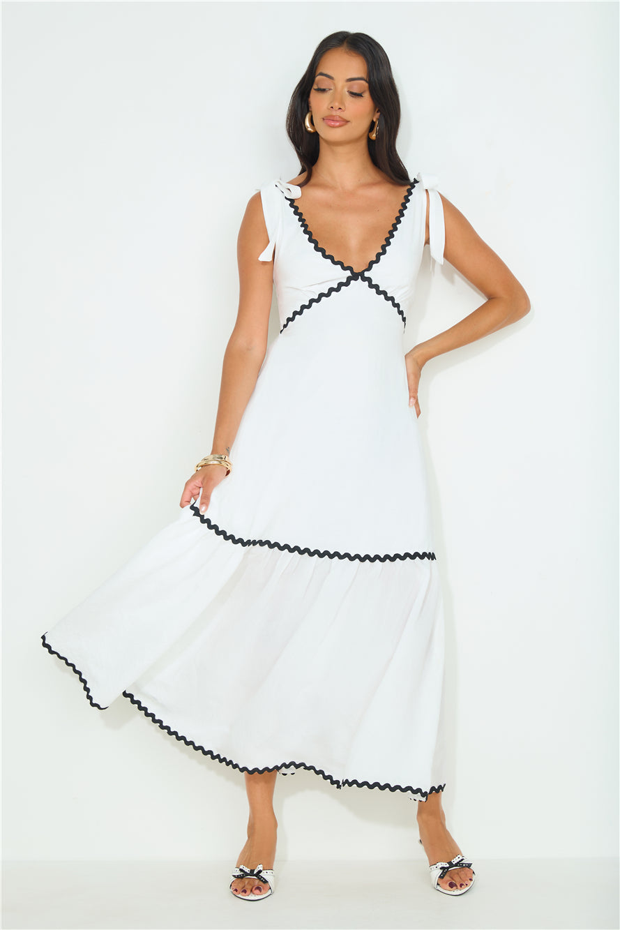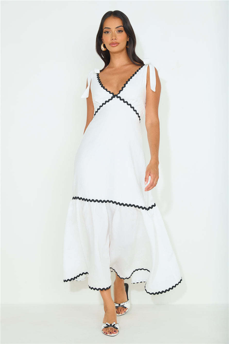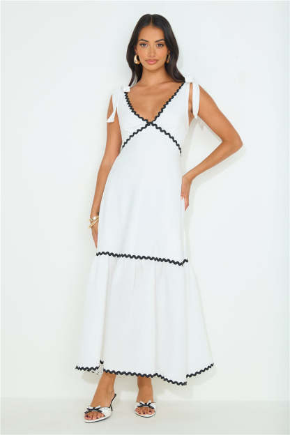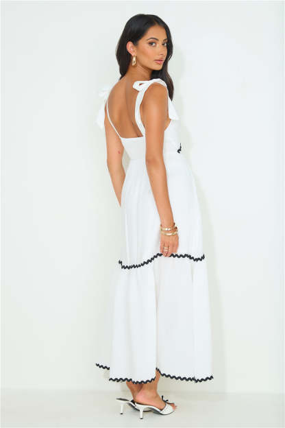 Feel chic and confident in the Sara Loves Maxi Dress. Featuring a black wavy trim. tie-up shoulder straps and a flowy skirt. Style with sandals for a gorgeous day 'fit.