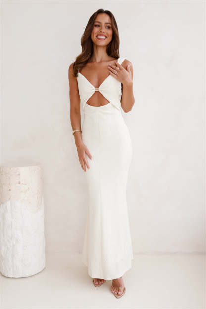 Into paradise with the Seychelles Island Maxi Dress. Featuring a cutout to the top. gold hardware details and the most luxurious straight. flowy skirt. Style with sandals for the ultimate vacay 'fit.