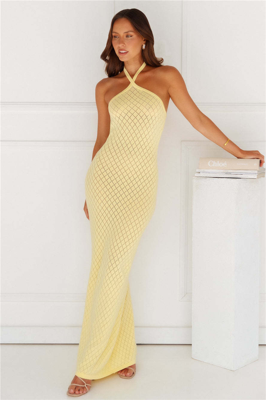 Your beach club essential. The Simi Maxi Dress by RUNAWAY features a luxe knit design. a halter tie and a slip on style. Pair it with slides and accessories.